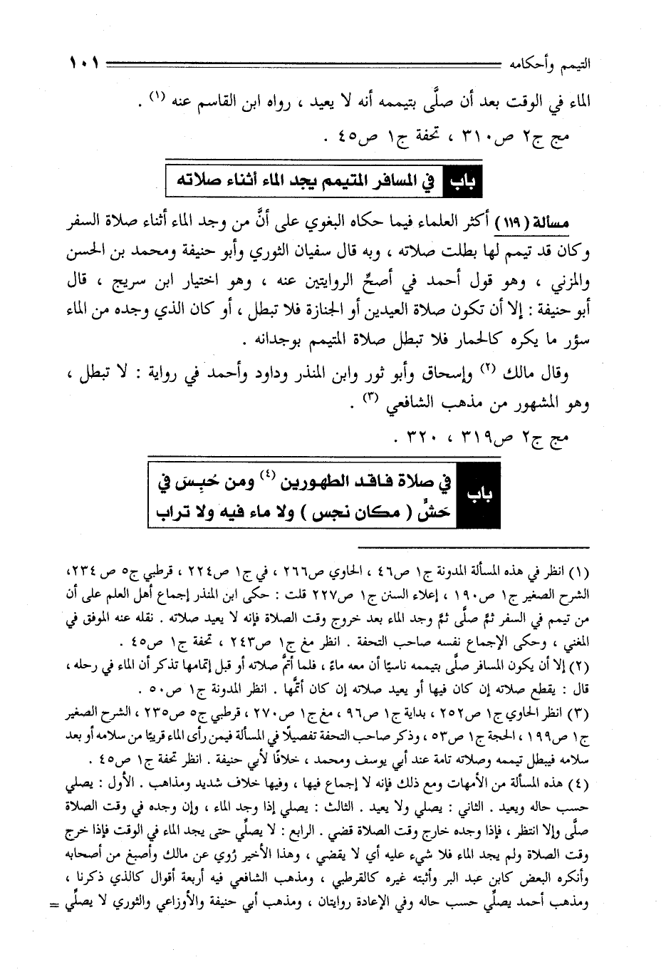 مسألة (119) أكثر العلماء فيما حكاه البغوي على أنَّ من وجد الماء أثناء صلاة السفر وكان قد تيمم لها بطلت صلاته، وبه قال سفيان الثوري وأبو حنيفة ومحمد بن الحسن والمزني، وهو قول أحمد في أصحِّ الروايتين عنه، وهو اختيار ابن سريج، قال أبو حنيفة: إلا أن تكون صلاة العيدين أو الجنازة فلا تبطل، أو كان الذي وجده من الماء سؤر ما يكره كالحمار فلا تبطل صلاة المتيمم بوجدانه.