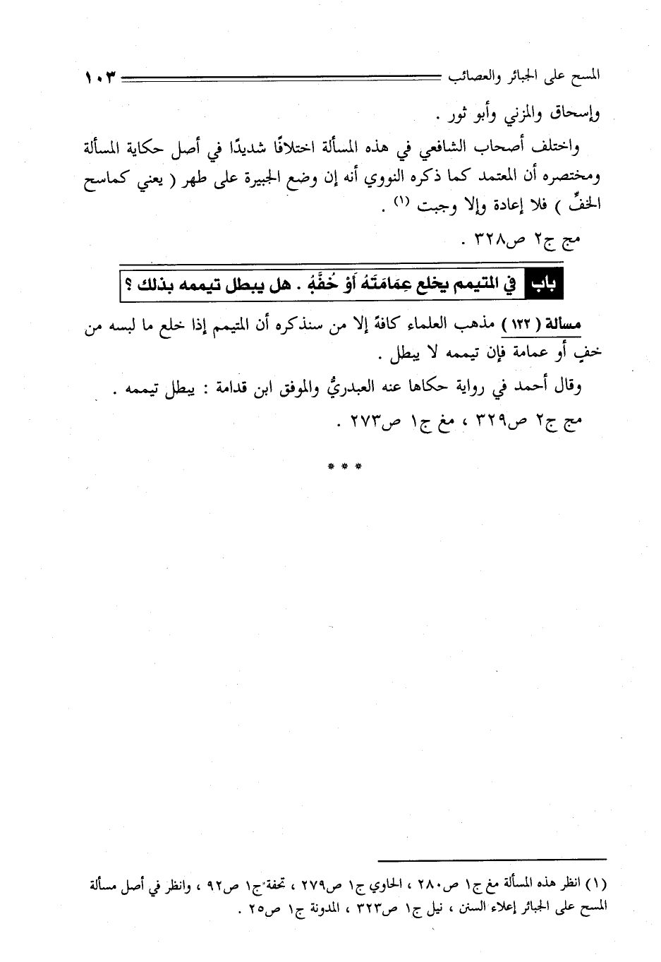 (¬1) انظر هذه المسألة مغ ج 1 ص 280، الحاوي ج 1 ص 279، تحفة ج 1 ص 92، وانظر في أصل مسألة المسح على الجبائر إعلاء السنن, نيل ج 1 ص 323، المدونة ج 1 ص 25.