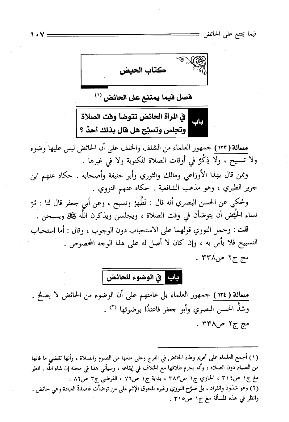 مسألة (133) جمهور العلماء من السَّلف والخلف على أن الحائض ليس عليها وضوء ولا تسبيح، ولا ذِكْرٌ في أوقات الصلاة المكتوبة ولا في غيرها.