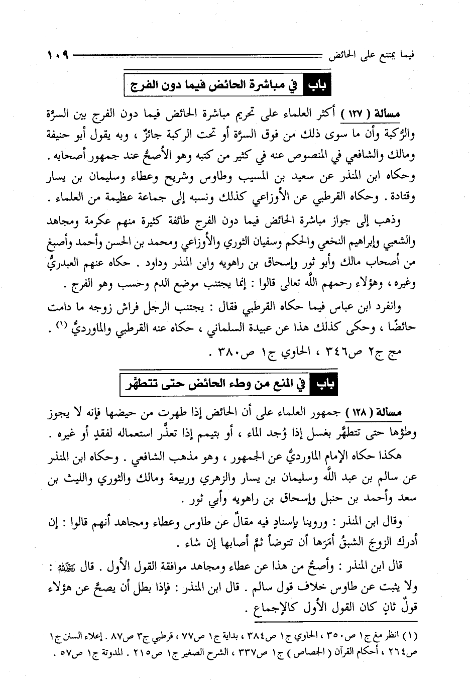 مسألة (127) أكثر العلماء على تحريم مباشرة الحائض فيما دون الفرج بين السرة والركبة وأن ما سوى ذلك من فوق السرَّة أو تحت الركبة جائزٌ، وبه يقول أبو حنيفة ومالك والشافعي في المنصوص عنه في كثير من كتبه وهو الأصحُّ عند جمهور أصحابه.