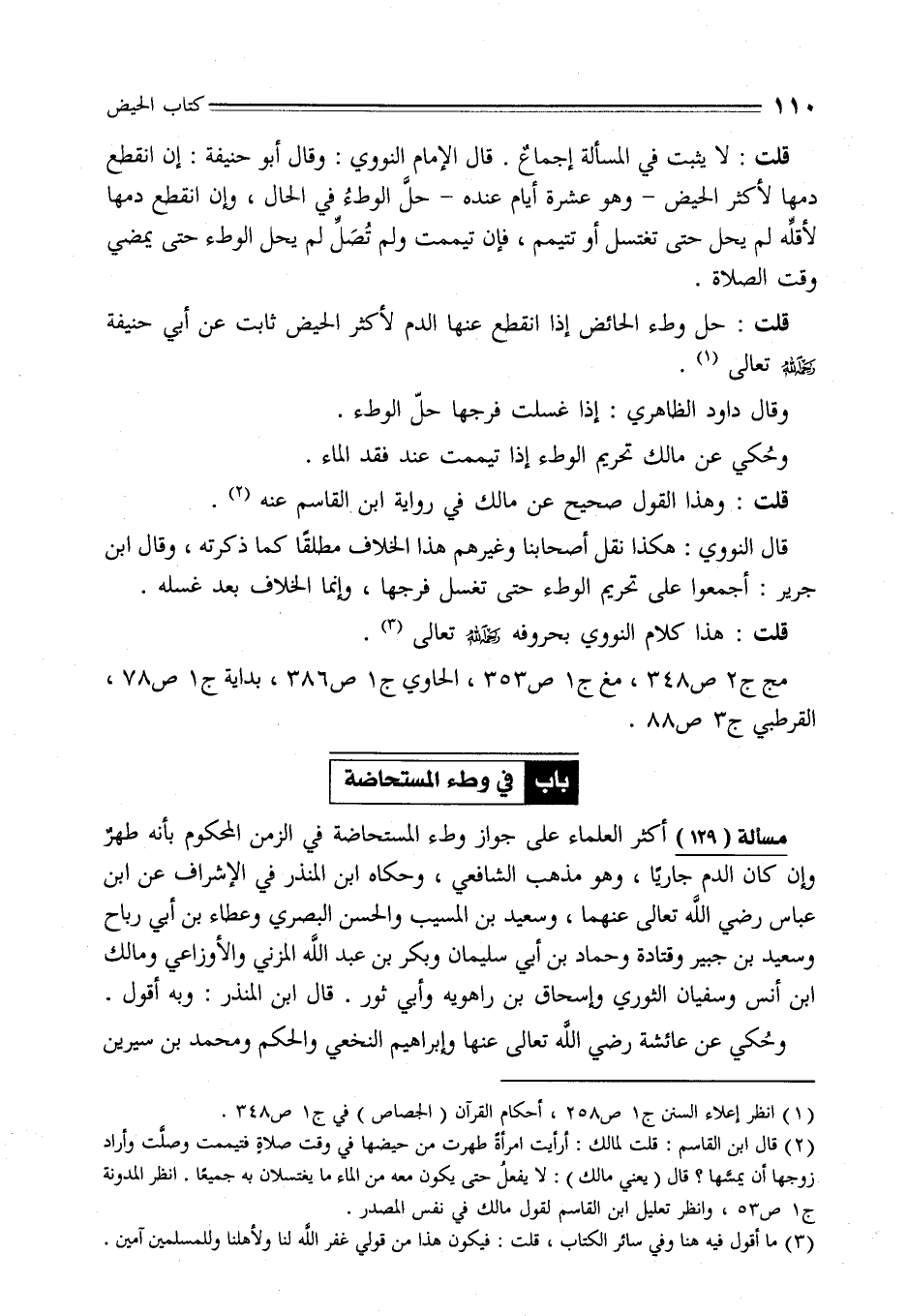 مسألة (129) أكثر العلماء على جواز وطء المستحاضة في الزمن المحكوم بأنه طهرٌ وإن كان الدم جاريًا، وهو مذهب الشافعي، وحكاه ابن المنذر في الإشراف عن ابن عباس رضي الله تعالى عنهما، وسعيد بن المسيب والحسن البصري وعطاء بن أبي رباح وسعيد بن جبير وقتادة وحماد بن أبي سليمان وبكر بن عبد الله المزني والأوزاعي ومالك ابن أنس وسفيان الثوري وإسحاق بن راهويه وأبي ثور. قال ابن المنذر: وبه أقول.