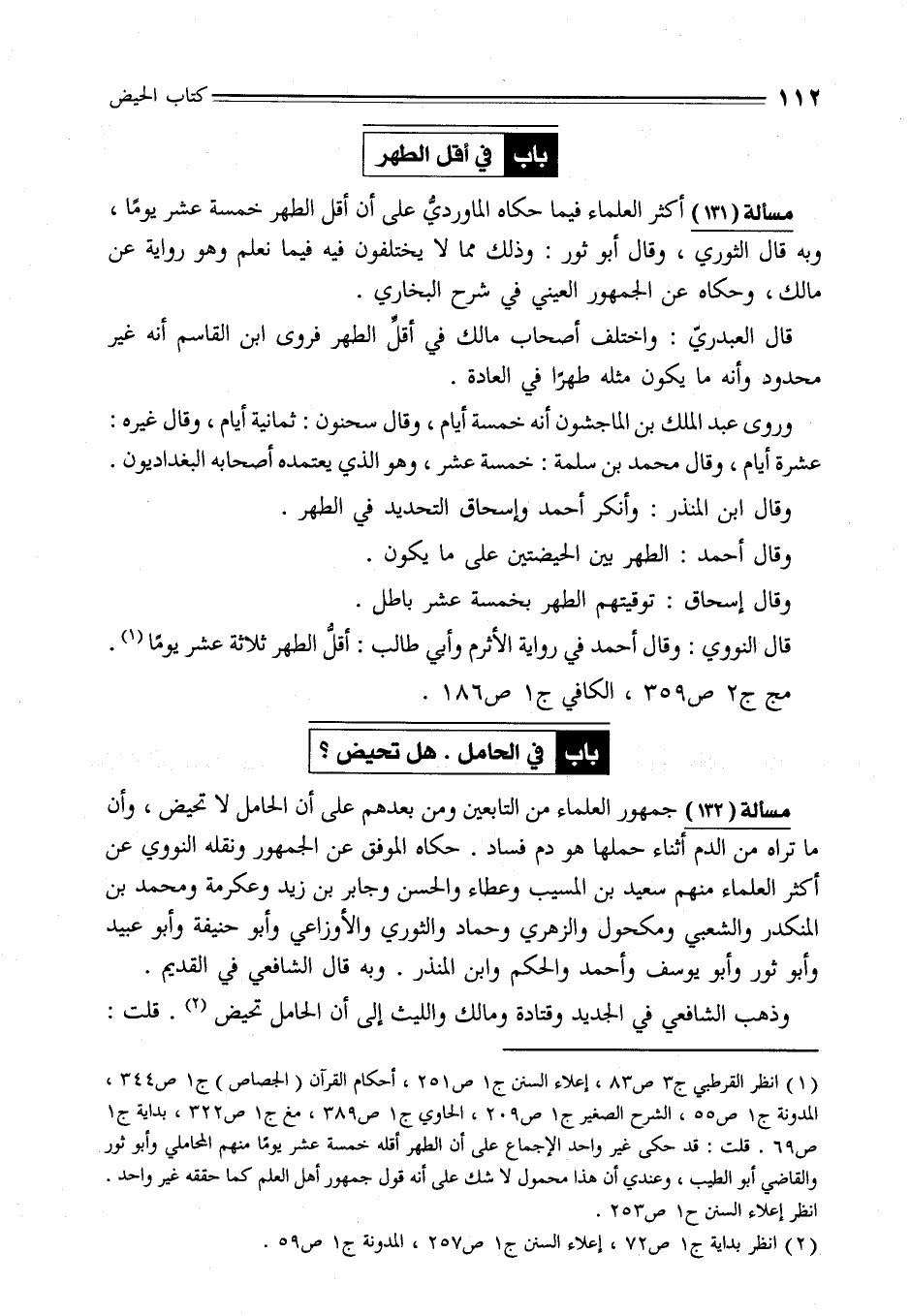 مسألة (131) أكثر العلماء فيما حكاه الماورديُّ على أن أقل الطهر خمسة عشر يومًا، وبه قال الثوري، وقال أبو ثور: وذلك مما لا يختلفون فيه فيما نعلم وهو رواية عن مالك، وحكاه عن الجمهور العيني في شرح البخاري.