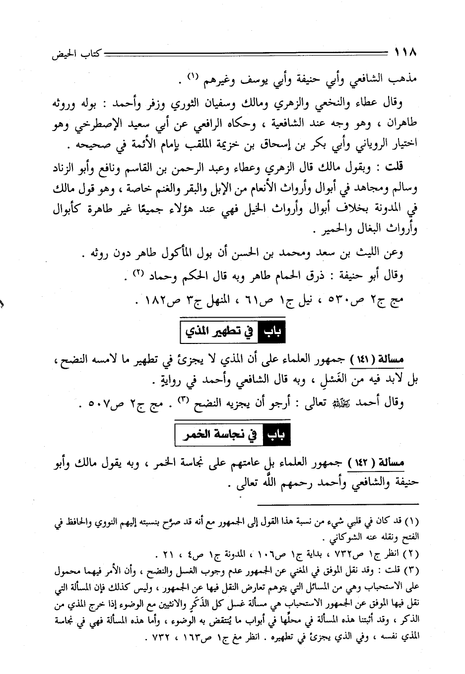 (¬3) قلت: وقد نقل الموفق في المغني عن الجمهور عدم وجوب الغسل والنضح، وأن الأمر فيهما محمول على الاستحباب وهي من المسائل التي يتوهم تعارض النقل فيها عن الجمهور، وليس كذلك فإن المسألة التي نقل فيها الموفق عن الجمهور الاستحباب هي مسألة غسل كل الذَكَر والانثيين مع الوضوء إذا خرج المذي من الذكر، وقد أثبتنا هذه المسألة في محلها في أبواب ما يُنتقض به الوضوء، وأما هذه المسألة فهي في نجاسة المذي نفسه، وفي الذي يجزئ في تطهيره. انظر مغ ج 1 ص 163، 732.