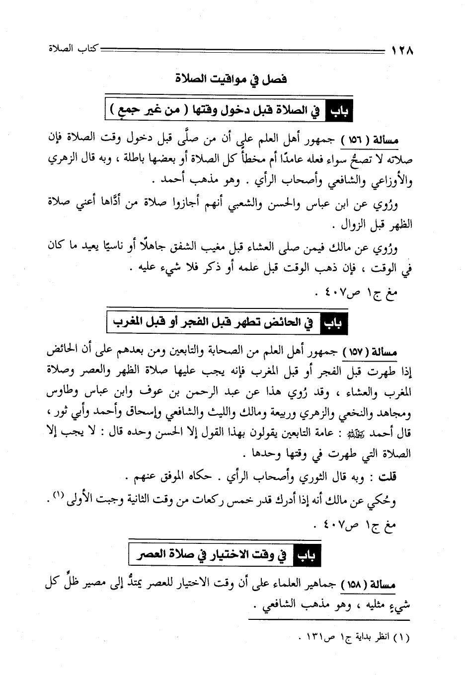 مسألة (157) جمهور أهل العلم من الصحابة والتابعين ومن بعدهم على أن الحائض إذا طهرت قبل الفجر أو قبل المغرب فإنه يجب عليها صلاة الظهر والعصر وصلاة المغرب والعشاء، وقد رُوي هذا عن عبد الرحمن بن عوف وابن عباس وطاوس ومجاهد والنخعي والزهري وربيعة ومالك والليث والشافعي وإسحاق وأحمد وأبي ثور، قال أحمد -رحمه الله-: عامة التابعين يقولون بهذا القول إلا الحسن وحده قال: لا يجب إلا الصلاة التي طهرت في وقتها وحدها.