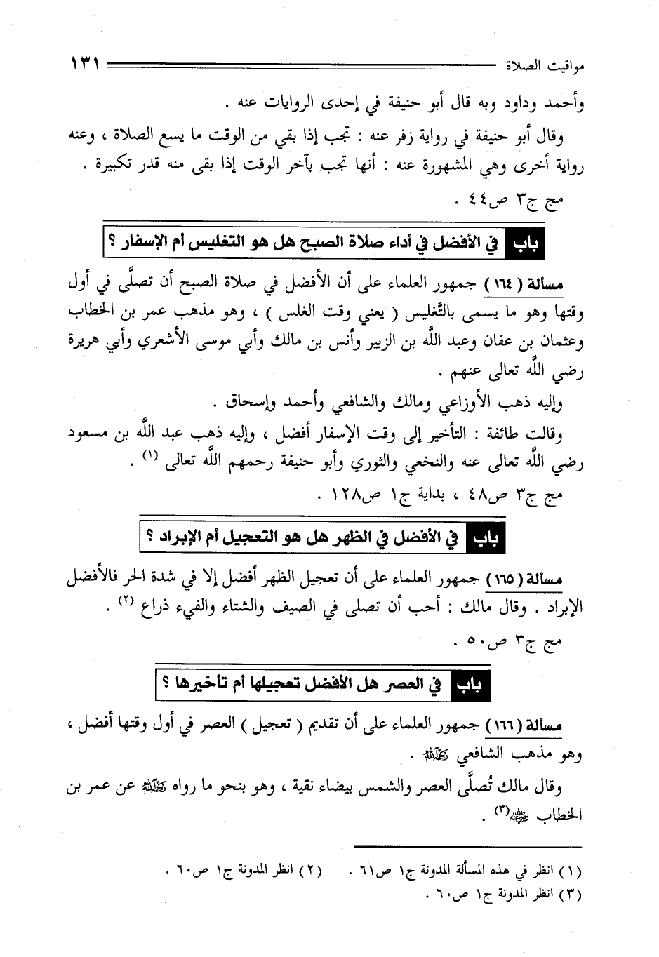 مسألة (164) جمهور العلماء على أن الأفضل في صلاة الصبح أن تصلَّى في أول وقتها وهو ما يسمى بالتَّغليس (يعني وقت الغلس)، وهو مذهب عمر بن الخطاب وعثمان بن عفان وعبد الله بن الزبير وأنس بن مالك وأبي موسى الأشعري وأبي هريرة رضي الله تعالى عنهم.