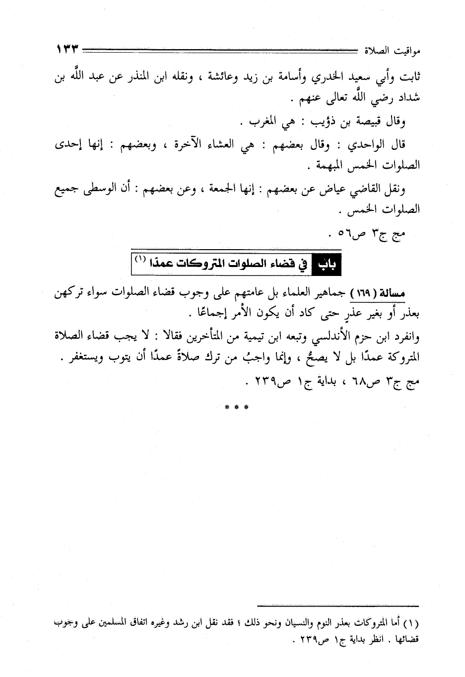 مسألة (169) جماهير العلماء بل عامتهم على وجوب قضاء الصلوات سواء تركهن بعذر أو بغير عذرٍ حتى كاد أن يكون الأمر إجماعًا.