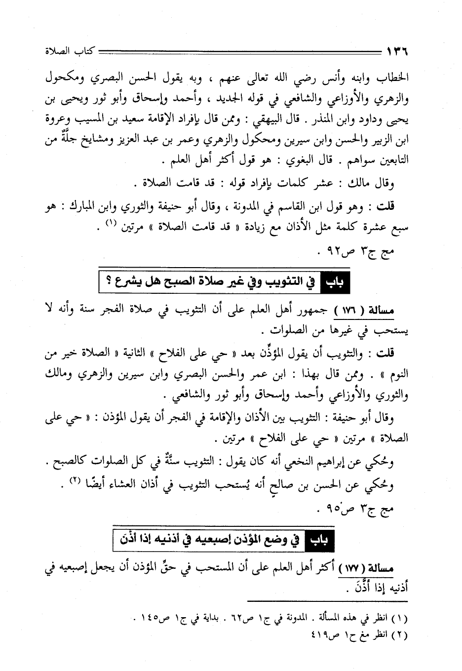 مسألة (176) جمهور أهل العلم على أن التثويب في صلاة الفجر سنة وأنه لا يستحب في غيرها من الصلوات.