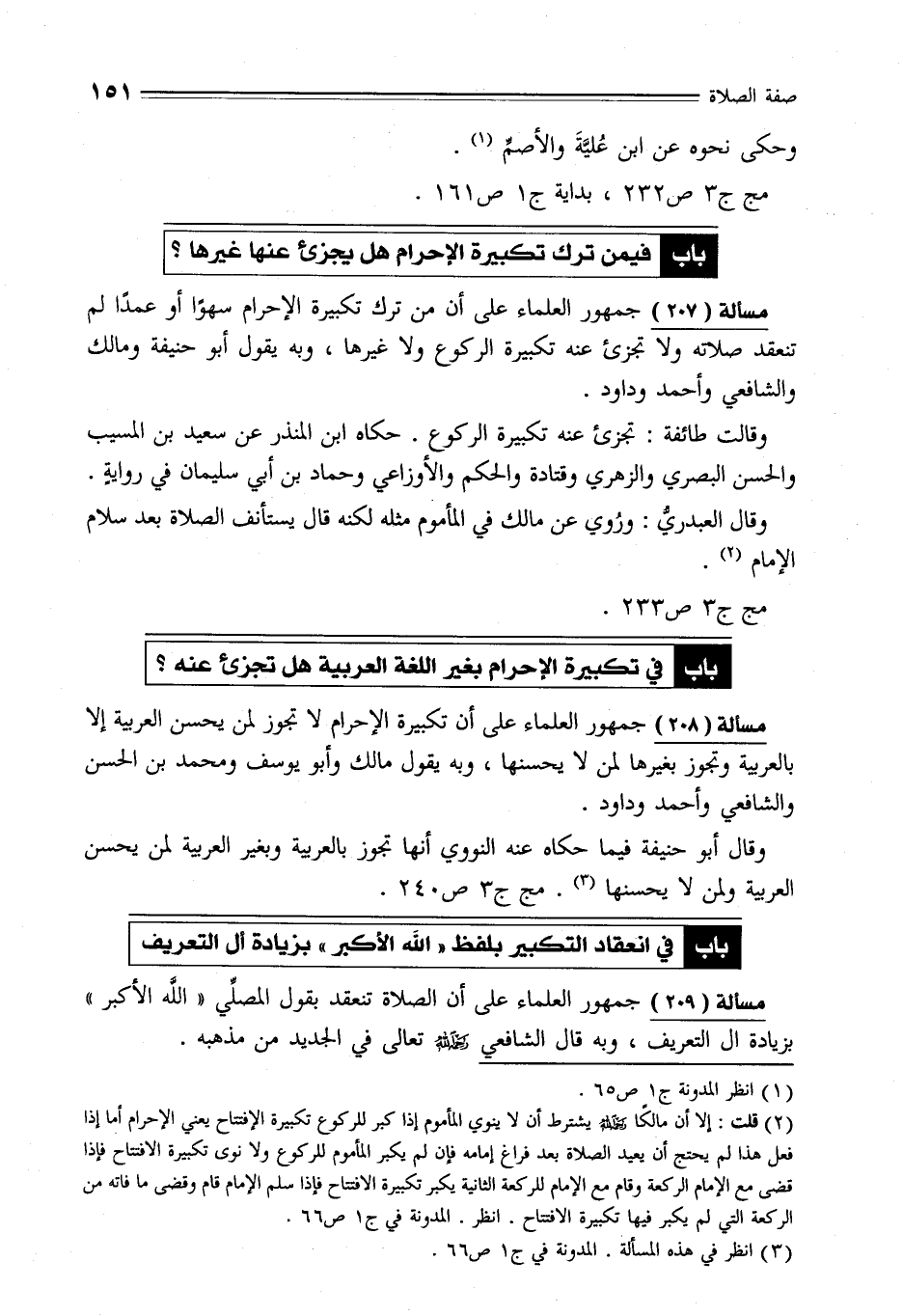 مسألة (207) جمهور العلماء على أن من ترك تكبيرة الإحرام سهواً أو عمدًا لم