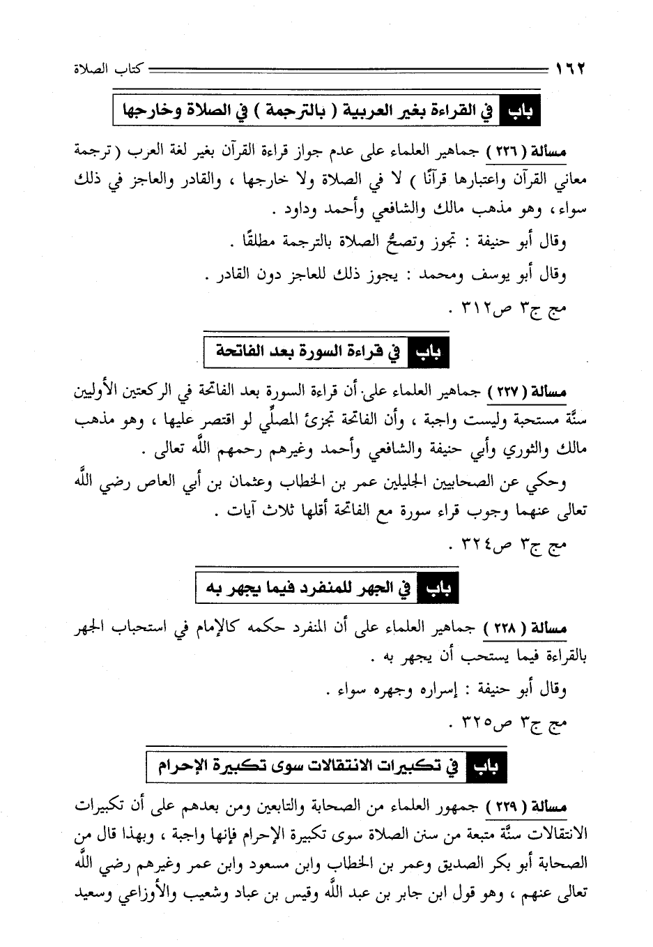 مسألة (229) جمهور العلماء من الصحابة والتابعين ومن بعدهم على أن تكبيرات الانتقالات سنَّة متبعة من سنن الصلاة سوى تكبيرة الإحرام فإنها واجبة، وبهذا قال من الصحابة أبو بكر الصديق وعمر بن الخطاب وابن مسعود وابن عمر وغيرهم رضي الله تعالى عنهم، وهو قول ابن جابر بن عبد الله وقيس بن عباد وشعيب والأوزاعي وسعيد