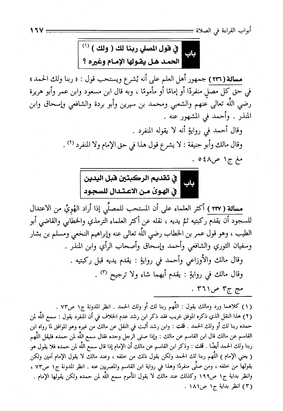 مسألة (236) جمهور أهل العلم على أنه يُشرع ويستحب قول: "ربنا ولك الحمد" في حق كل فصل منفردًا أو إمامًا أو مأمومًا، وبه قال ابن مسعود وابن عمر وأبو هريرة رضي الله تعالى عنهم والشعبي ومحمد بن سيرين وأبو بردة والشافعي وإسحاق وابن المنذر. وأحمد في المشهور عنه.