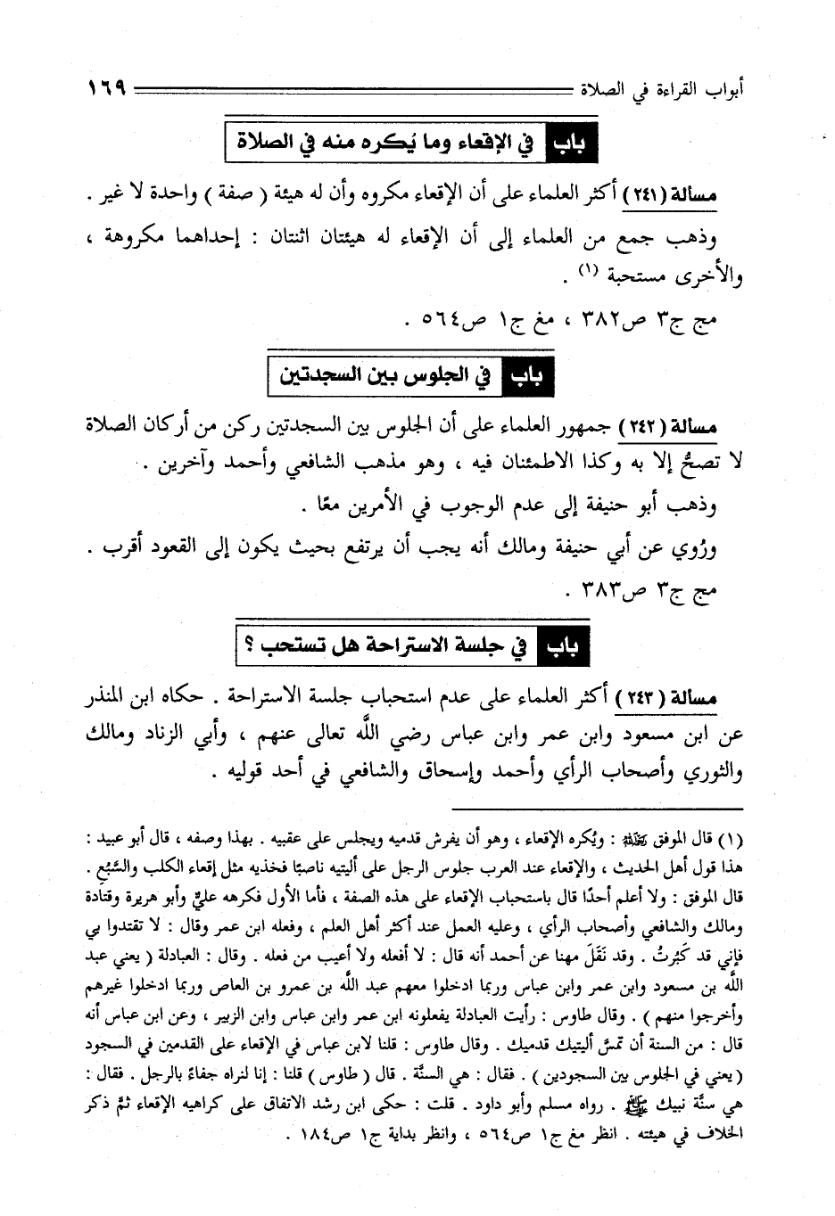 (¬1) قال الموفق -رحمه الله-: ويُكره الإقعاء، وهو أن يفرش قدميه ويجلس على عقبيه. بهذا وصفه، قال أبو عبيد: هذا قول أهل الحديث، والإقعاء عند العرب جلوس للرجل على أليتيه ناصبًا فخذيه مثل إقعاء الكلب والسَّبُعِ. قال الموفق: ولا أعلم أحدًا قال باستحباب الإقعاء على هذه الصفة، فأما الأول فكرهه عليٍّ وأبو هريرة وقتادة ومالك والشافعي وأصحاب الرأي، وعليه العمل عند أكثر أهل العلم، وفعله ابن عمر وقال: لا تقتدوا بي فإني قد كَبُرتُ. وقد نَقَلَ مهنا عن أحمد أنه قال: لا أفعله ولا أعيب من فعله. وقال: العبادلة (يعني عبد الله بن مسعود وابن عمر وابن عباس وربما ادخلوا معهم عبد الله بن عمرو بن العاص وربما ادخلها غيرهم وأخرجوا منهم). وقال طاوس: رأيت العبادلة يفعلونه ابن عمر وابن عباس وابن الزبير، وعن ابن عباس أنه قال: من السنة أن تمسَّ أليتيك قدميك. وقال طاوس: قلنا لابن عباس في الإقعاء على القدمين في السجود (يعني في الجلوس بين السجودين). فقال: هي السنَّة. قال (طاوس) قلنا: إنا لنراه جفاءً بالرجل. فقال: هي سنُّة نبيك - صلى الله عليه وسلم -. رواه مسلم وأبو داود. قلت: حكى ابن رشد الاتفاق على كراهيه الإقعاء ثم ذكر الخلاف في هيئته. انظر مغ ج 1 ص 564، وانظر بداية ج 1 ص 184.