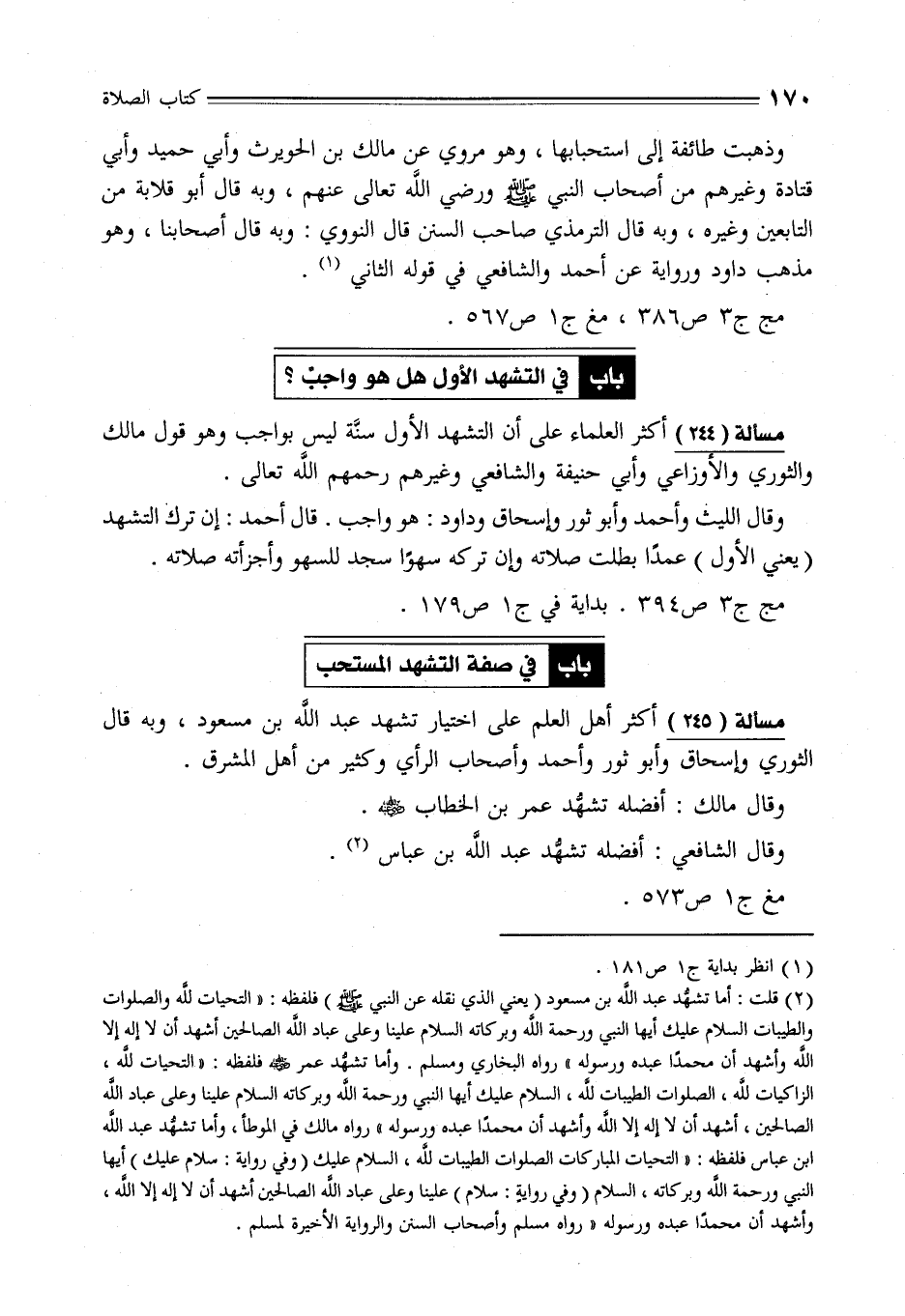مسألة (245) أكثر أهل العلم على اختيار تشهد عبد الله بن مسعود، وبه قال الثوري وإسحاق وأبو ثور وأحمد وأصحاب الرأي وكثير من أهل المشرق.