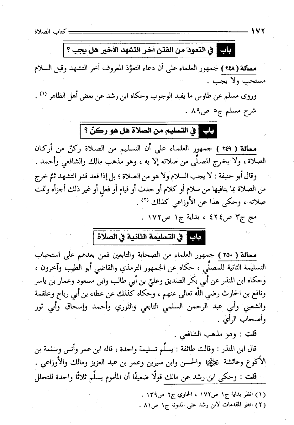 مسألة (250) جمهور العلماء من الصحابة والتابعين فمن بعدهم على استحباب التسليمة الثانية للمصلي، حكاه عن الجمهور الترمذي والقاضي أبو الطيب وآخرون، وحكاه ابن المنذر عن أبي بكر الصديق وعليٍّ بن أبي طالب وابن مسعود وعمار بن ياسر ونافع بن الحارث رضي الله تعالى عنهم، وحكاه كذلك عن عطاء بن أبي رباح وعلقمة والشعبي وأبي عبد الرحمن السلمي التابعي والثورى وأحمد وإسحاق وأبي ثور وأصحاب الرأي.
