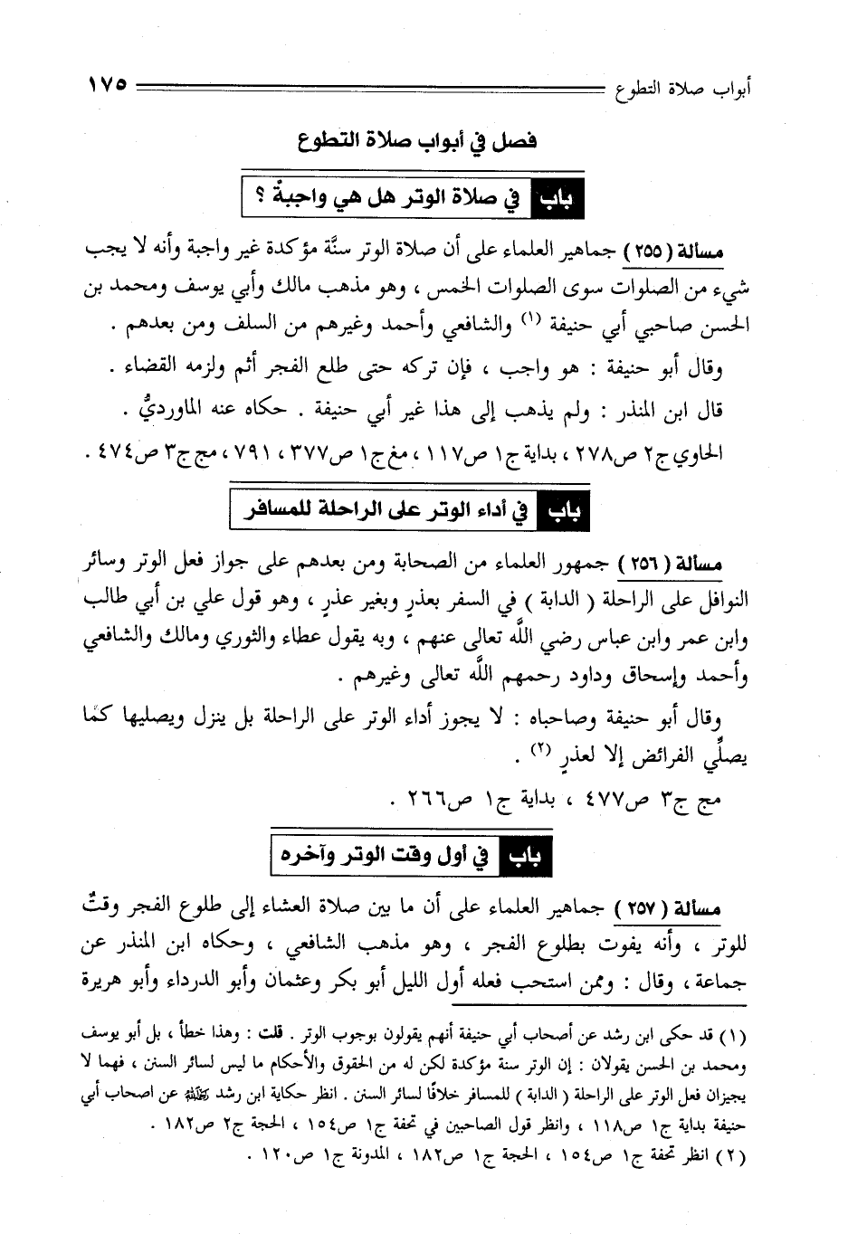 (¬1) قد حكى ابن رشد عن أصحاب أبي حنيفة أنهم يقولون بوجوب الوتر. قلت: وهذا خطأ، بل أبو يوسف ومحمد بن الحسن يقولان: إن الوتر سنة مؤكدة لكن له من الحقوق والأحكام ما ليس لسائر السنن, فهما لا يجيزان فعل الوتر على الراحلة (الدابة) للمسافر خلافًا لسائر السنن. انظر حكاية ابن رشد -رحمه الله- عن أصحاب أبي حنيفة بداية ج 1 ص 118، وانظر قول الصاحبين في تحفة ج 1 ص 154، الحجة ج 2 ص 182.