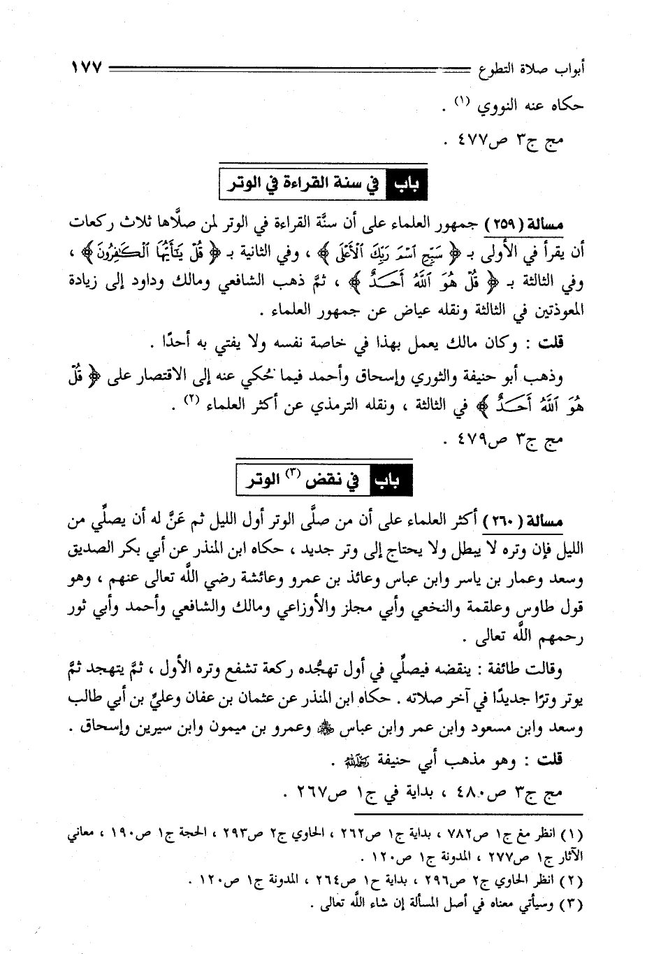 مسألة (259) جمهور العلماء على أن سنَّة القراءة في الوتر لمن صلَّاها ثلاث ركعات أن يقرأ في الأولى بـ {سَبِّحِ اسْمَ رَبِّكَ الْأَعْلَى}، وفي الثانية بـ {قُلْ يَا أَيُّهَا الْكَافِرُونَ}، وفي الثالثة بـ {قُلْ هُوَ اللَّهُ أَحَدٌ}، ثمّ ذهب الشافعي ومالك وداود إلى زيادة المعوذتين في الثالثة ونقله عياض عن جمهور العلماء.