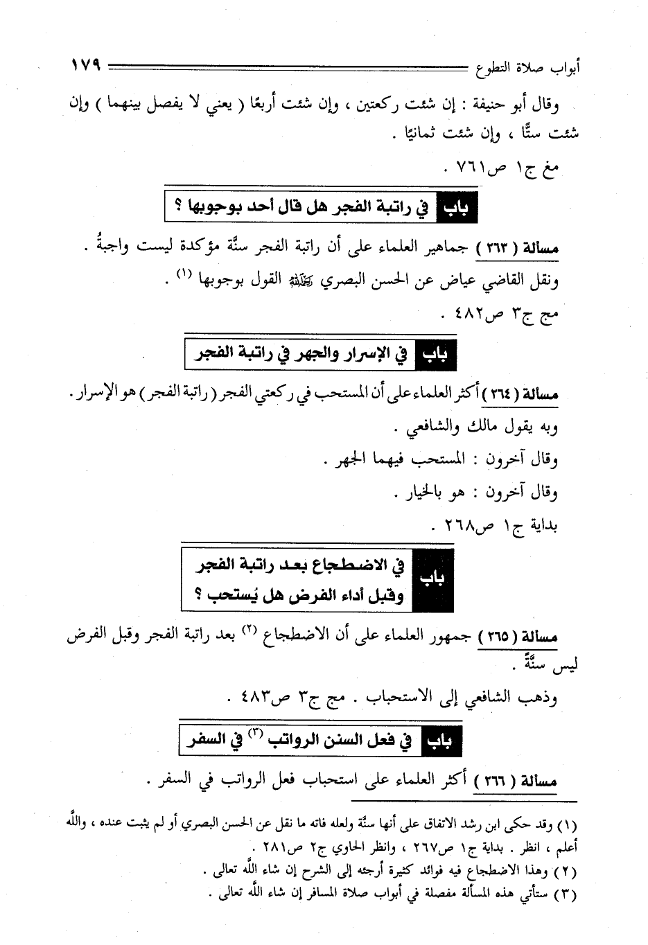 مسألة (263) جماهير العلماء على أن راتبة الفجر سنَّة مؤكدة ليست واجبةُ.