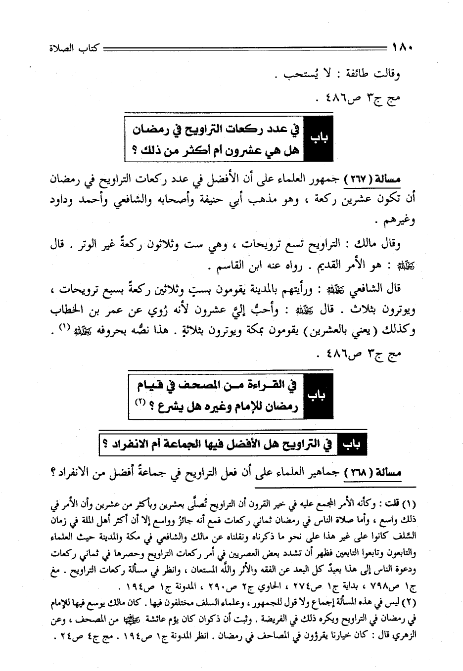 (¬1) قلت: وكأنه الأمر المجمع عليه في خير القرون أن التراويح تُصلَّى بعشرين وبأكثر من عشرين وأن الأمر في ذلك واسع، وأما صلاة الناس في رمضان ثماني ركعات فمع أنه جائزُ وواسع إلا أن أكثر أهل الملة في زمان السَّلف كانوا على غير هذا على نحو ما ذكرناه ونقلناه عن مالك والشافعي في مكة والمدينة حيث العلماء والتابعون وتابعوا التابعين فظهر أن تشدد بعض العصريين في أمر ركعات التراويح وحصرها في ثماني ركعات ودعوة الناس إلى هذا بعيد كل البعد عن الفقه والأثر والله المستعان، وانظر في مسألة ركعات التراويح - مغ ج 1 ص 798، بداية ج 1 ص 274، الحاوي ج 2 ص 290، المدونة ج 1 ص 194.