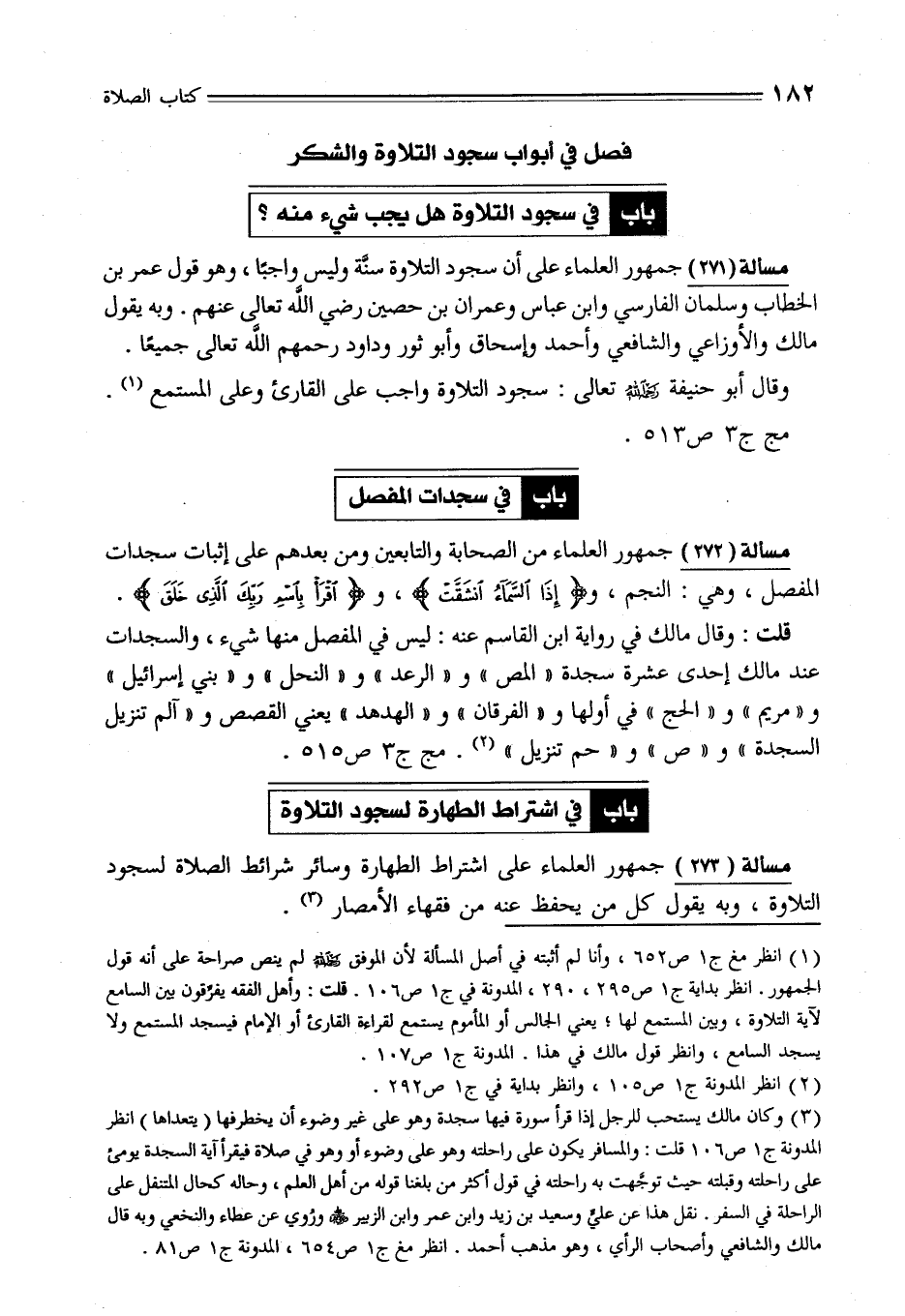 مسألة (272) جمهور العلماء من الصحابة والتابعين ومن بعدهم على إثبات سجدات المفصل، وهي: النجم {إِذَا السَّمَاءُ انْشَقَّتْ}، {اقْرَأْ بِاسْمِ رَبِّكَ الَّذِي خَلَقَ}.