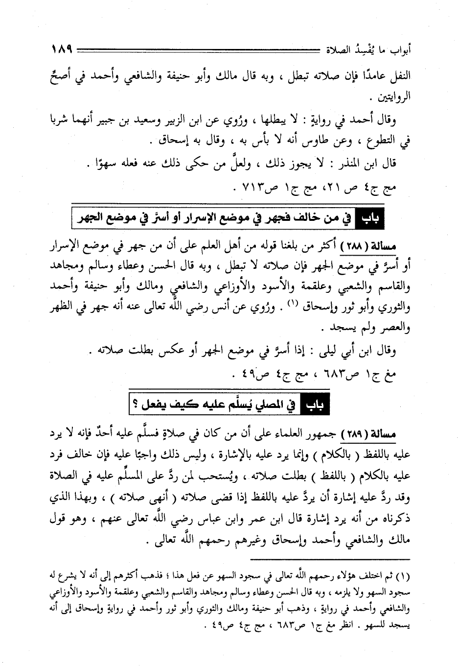 مسألة (288) أكثر من بلغنا قوله من أهل العلم على أن من جهر في موضع الإسرار أو أسر في موضع الجهر فإن صلاته لا تبطل، وبه قال الحسن وعطاء وسالم ومجاهد والقاسم والشعبي وعلقمة والأسود والأوزاعي والشافعي ومالك وأبو حنيفة وأحمد والثوري وأبو ثور وإسحاق (¬1). ورُوي عن أنس رضي الله تعالى عنه أنه جهر في الظهر والعصر ولم يسجد.