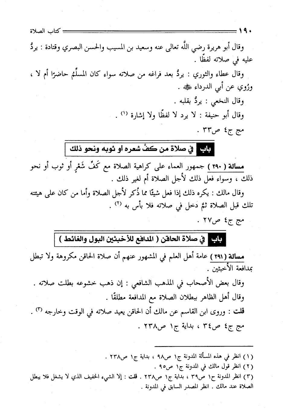 (¬3) انظر المدونة ح 1 ص 39، بداية ج 1 ص 238. قلت: إلا الشيء الخفيف الذي لا يشغل فلا يبطل الصلاة عند مالك. انظر المصدر السابق في المدونة.