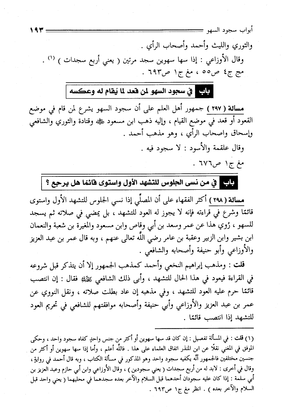 مسألة (298) أكثر الفقهاء على أن المصلِّي إذا نسي الجلوس للتشهد الأول واستوى قائمًا وشرع في قراءته فإنه لا يجوز له العود للتشهد، بل يمضي في صلاته ثم يسجد للسهو، رُوي هذا عن عمر وسعد بن أبي وقاص وابن مسعود والمغيرة بن شعبة والنعمان ابن بشير وابن الزبير وعقبة بن عامر رضي الله تعالى عنهم، وبه قال عمر بن عبد العزيز والأوزاعي وأبو حنيفة وأصحابه والشافعي.