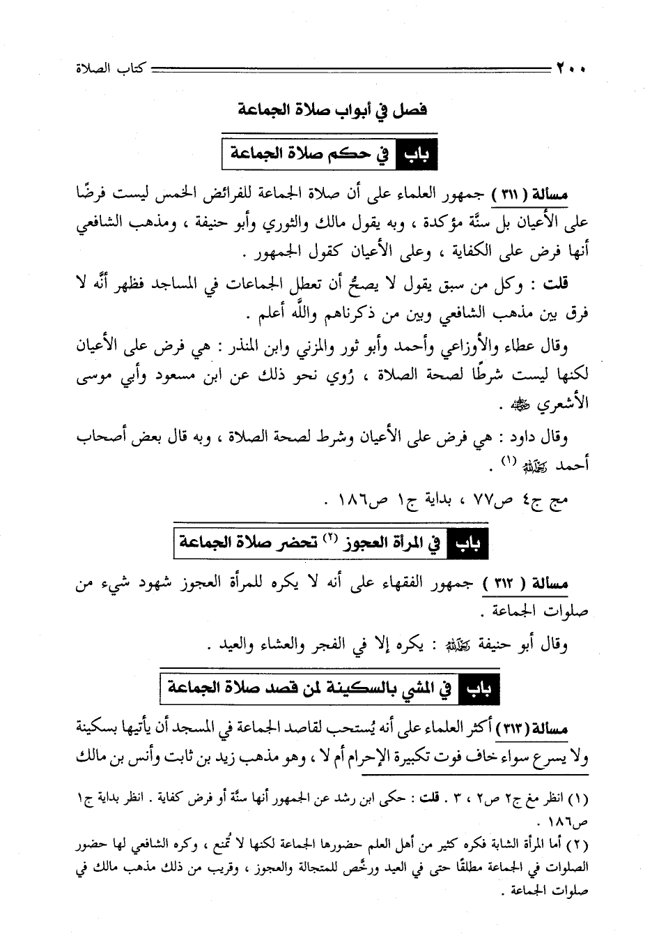 مسألة (311) جمهور العلماء على أن صلاة الجماعة للفرائض الخمس ليست فرضًا على الأعيان بل سنَة مؤكدة، وبه يقول مالك والثوري وأبو حنيفة، ومذهب الشافعي أنها فرض على الكفاية، وعلى الأعيان كقول الجمهور.