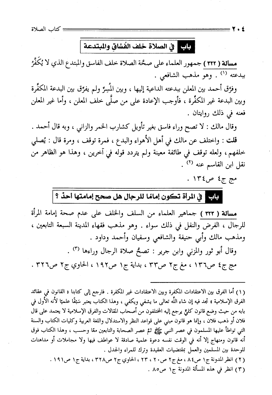 مسألة (333) جماهير العلماء من السلف والخلف على عدم صحة إمامة المرأة للرجال، الفرض والنفل في ذلك سواء. وهو مذهب فقهاء المدينة السبعة التابعين، ومذهب مالك وأبي حنيفة والشافعي وسفيان وأحمد وداود.