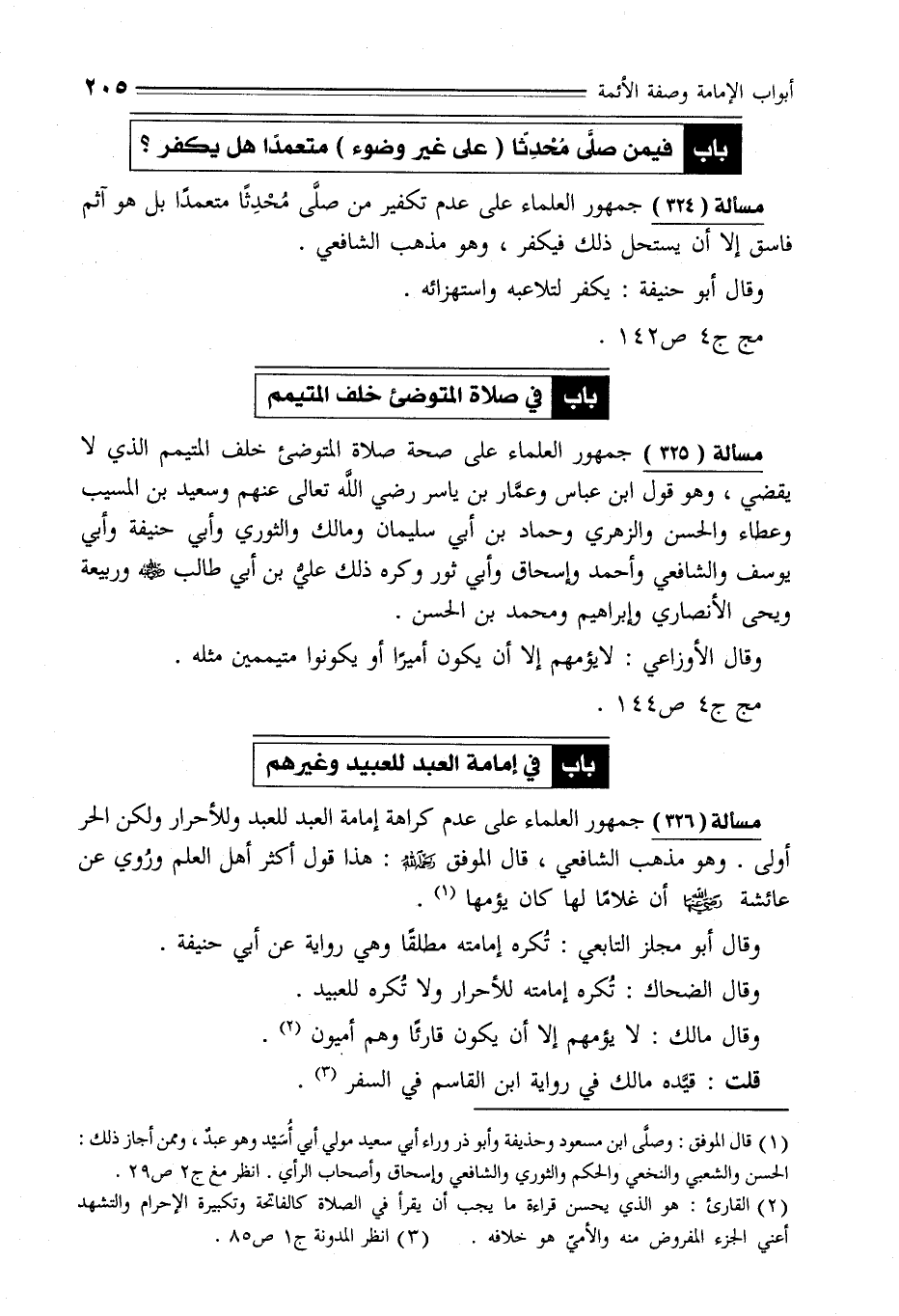 مسألة (326) جمهور العلماء على عدم كراهة إمامة العبد للعبد وللأحرار ولكن الحر أولى. وهو مذهب الشافعي، قال الموفق -رحمه الله-: هذا قول أكثر أهل العلم ورُوي عن عائشة - رضي الله عنهما -، أن غلامًا لها كان يؤمها (¬1).