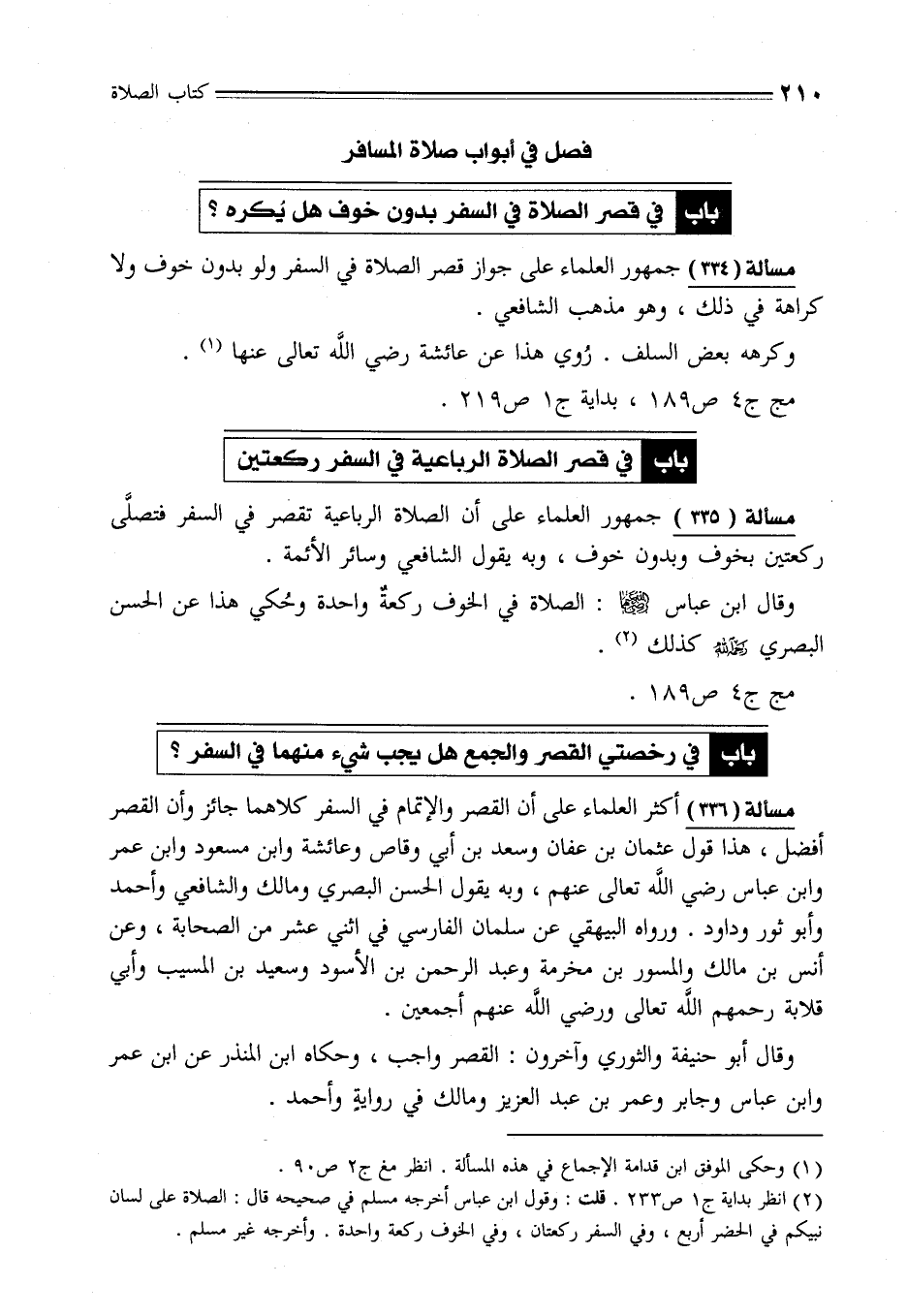 مسألة (336) أكثر العلماء على أن القصر والإتمام في السفر كلاهما جائز وأن القصر أفضل، هذا قول عثمان بن عفان وسعد بن أبي وقاص وعائشة وابن مسعود وابن عمر وابن عباس رضي الله تعالى عنهم، وبه يقول الحسن البصري ومالك والشافعي وأحمد وأبو ثور وداود. ورواه البيهقي عن سلمان الفارسي في اثني عشر من الصحابة، وعن أنس بن مالك والمسور بن مخرمة وعبد الرحمن بن الأسود وسعيد بن المسيب وأبي قلابة رحمهم الله تعالى ورضي الله عنهم أجمعين.