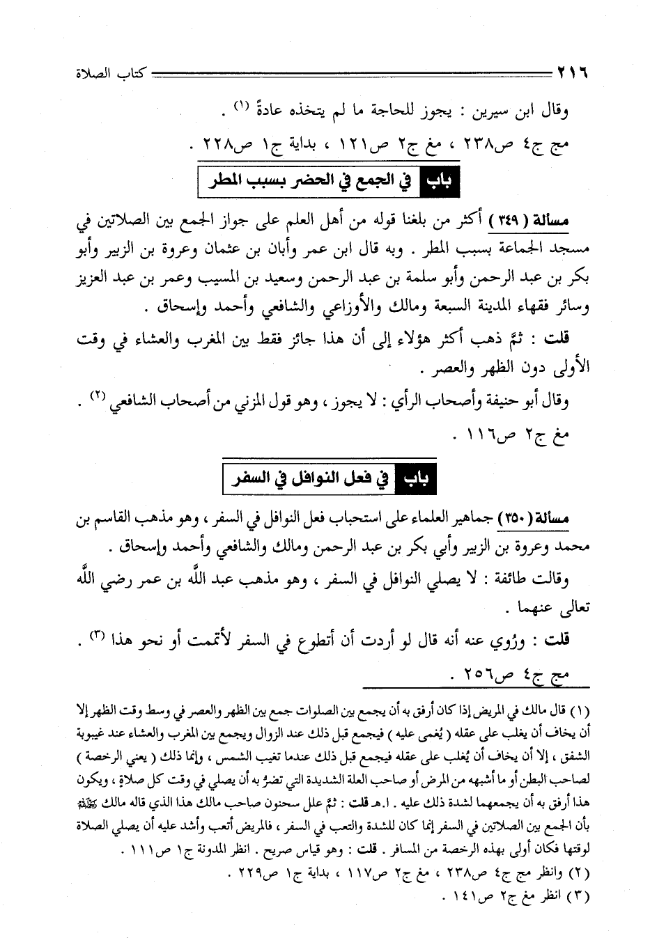 مسألة (350) جماهير العلماء على استحباب فعل النوافل في السفر، وهو مذهب القاسم بن محمَّد وعروة بن الزبير وأبي بكر بن عبد الرحمن ومالك والشافعي وأحمد وإسحاق.