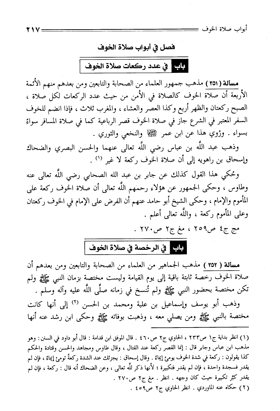 مسألة (352) مذهب الجماهير من العلماء من الصحابة والتابعين ومن بعدهم أن صلاة الخوف رخصة ثابتة باقية إلى يوم القيامة وليست مختصة بزمان النبي - صلى الله عليه وسلم - ولم تكن مختصة بحضور النبي - صلى الله عليه وسلم - ولم تُنسخ في زمانه صلى الله عليه وآله وسلم.