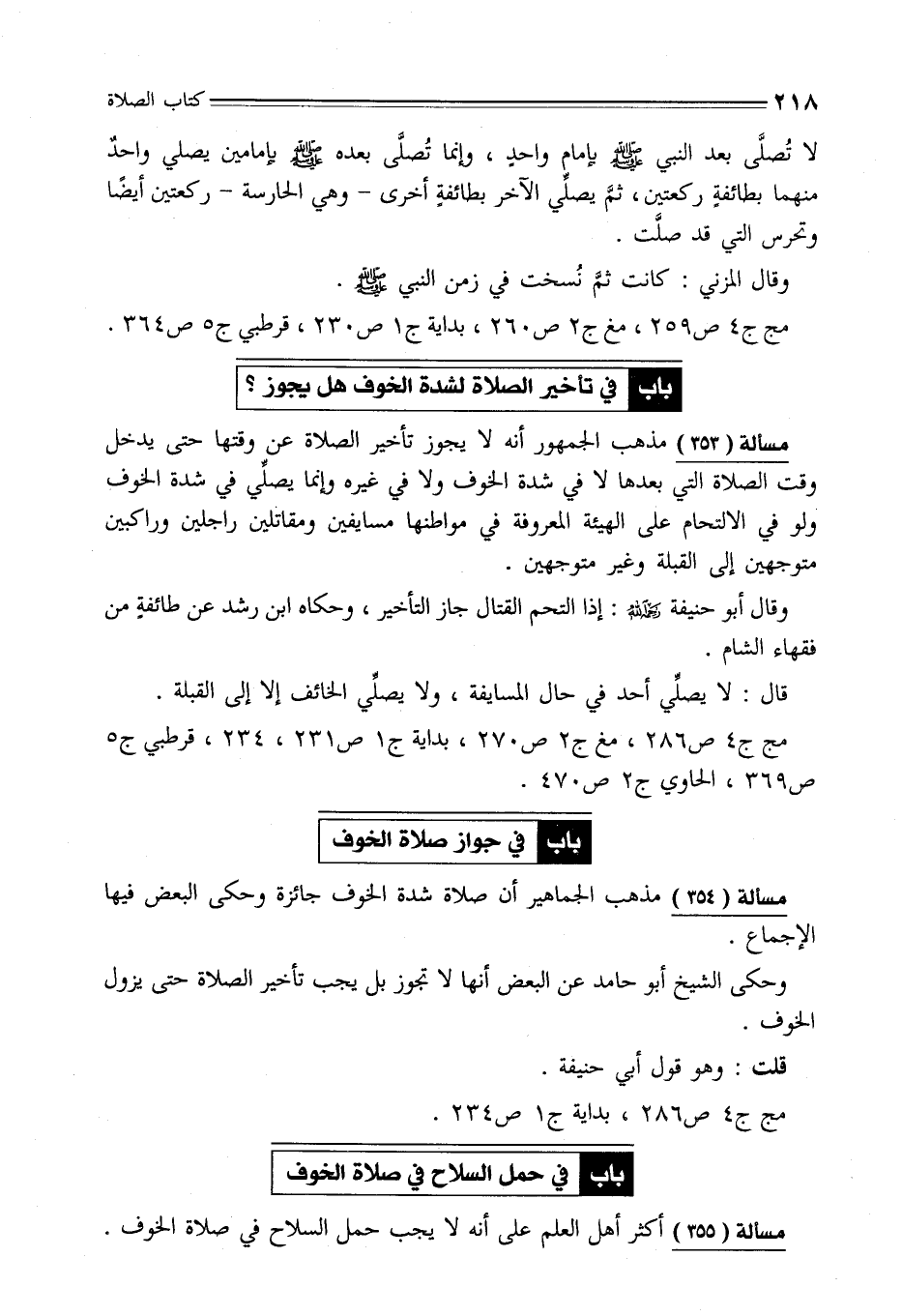 مسألة (354) مذهب الجماهير أن صلاة شدة الخوف جائزة وحكى البعض فيها الإجماع.