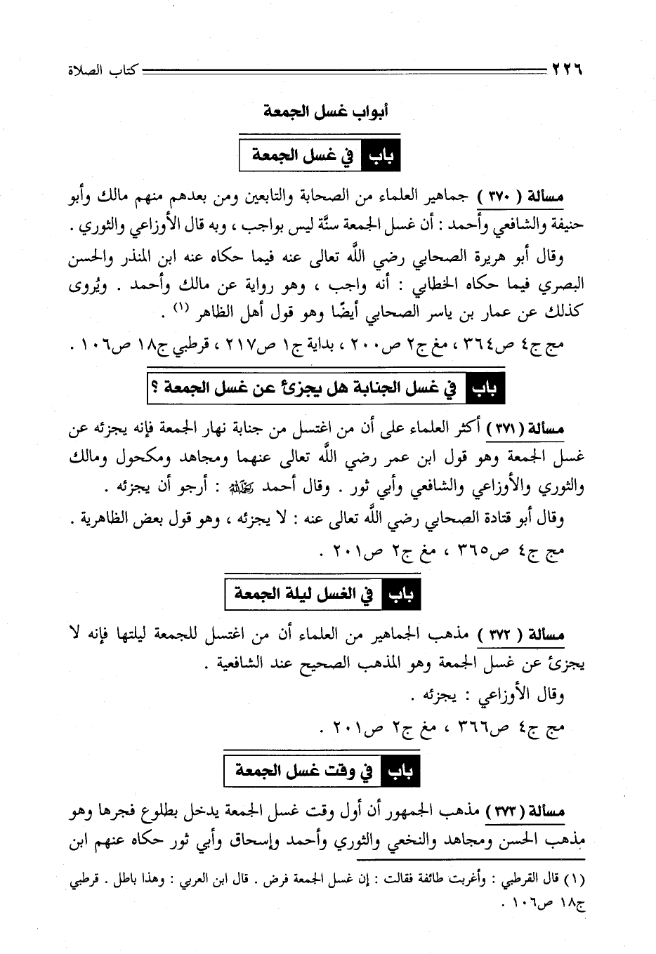 مسألة (370) جماهير العلماء من الصحابة والتابعين ومن بعدهم منهم مالك وأبو حنيفة والشافعي وأحمد: أن غسل الجمعة سنَّة ليس بواجب، وبه قال الأوزاعي والثوري.