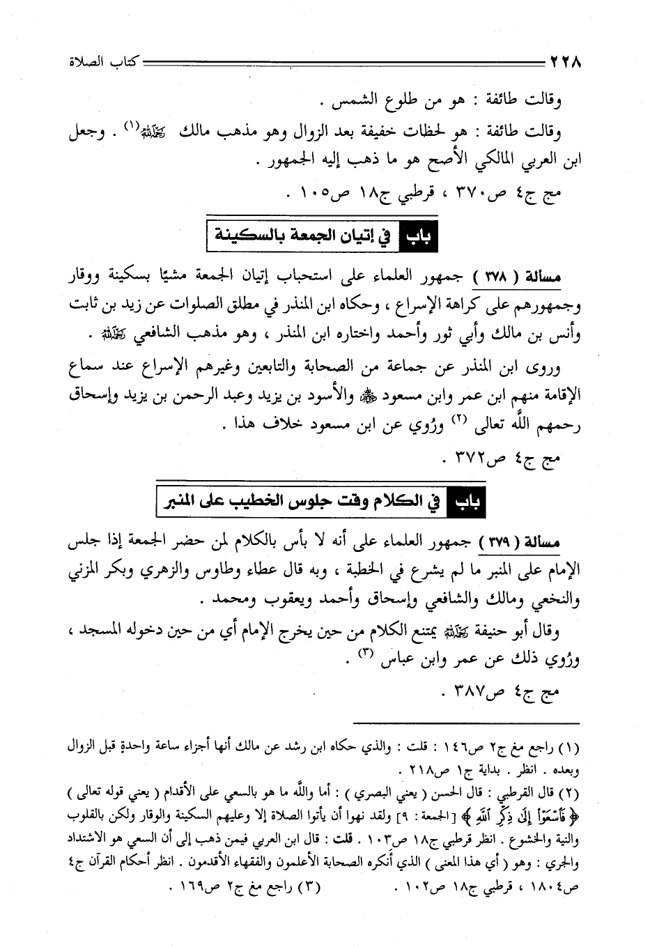 (¬2) قال القرطبي: قال الحسن (يعني البصري): أما والله ما هو بالسعي على الأقدام (يعني قوله تعالى) {فَاسْعَوْا إِلَى ذِكْرِ اللَّهِ} [الجمعة: 9]، ولقد نهوا أن يأتوا الصلاة إلا وعليهم السكينة والوقار ولكن بالقلوب والنية والخشوع. انظر قرطبي ج 18 ص 103. قلت: قال ابن العربي فيمن ذهب إلى أن السعي هو الاشتداد والجري: وهو (أي هذا المعنى) الذي أَنكره الصحابة الأعلمون والفقهاء الأقدمون. انظر أحكام القرآن ج 4 ص 1804، قرطبي ج 18 ص 102.