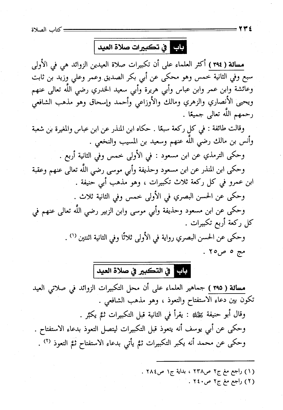 مسألة (394) أكثر العلماء على أن تكبيرات صلاة العيدين الزوائد هي في الأولى سبع وفي الثانية خمس وهو محكى عن أبي بكر الصديق وعمر وعلي وزيد بن ثابت وعائشة وابن عمر وابن عباس وأبي هريرة وأبي سعيد الخدري رضي الله تعالى عنهم ويحيى الأنصاري والزهري ومالك والأوزاعي وأحمد وإسحاق وهو مذهب الشافعي رحمهم الله تعالى جميعًا.