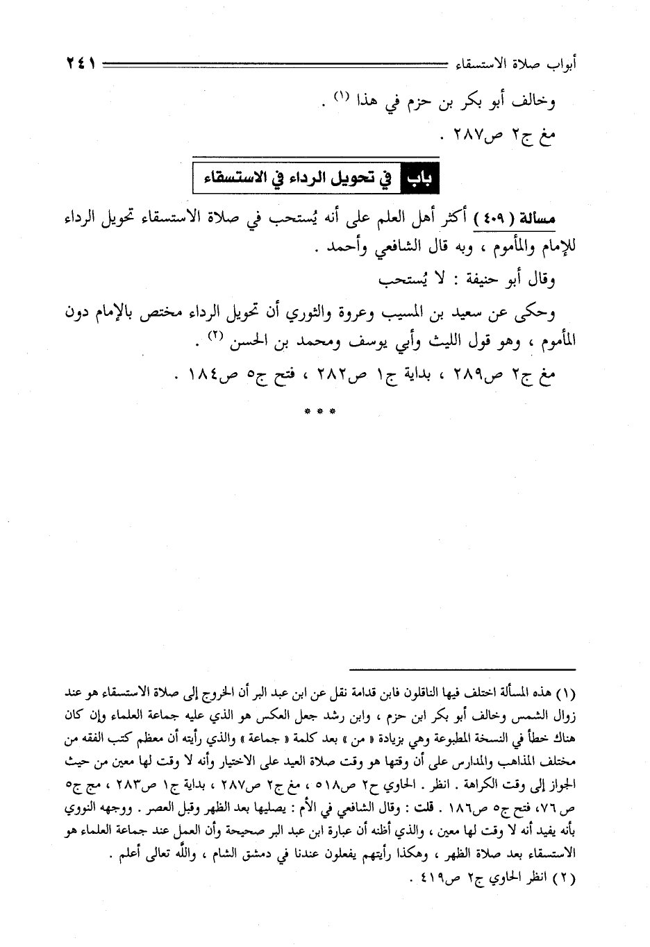 مسألة (409) أكثر أهل العلم على أنه يُستحب في صلاة الاستسقاء تحويل الرداء للإمام والمأموم، وبه قال الشافعي وأحمد.