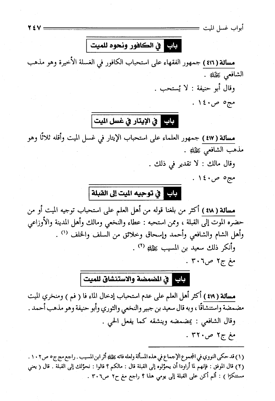 مسألة (419) أكثر أهل العلم على عدم استحباب إدخال الماء فا (فم) ومنخري الميت مضمضة واستنشاقًا، وبه قال سعيد بن جبير والنخعي والثوري وأبو حنيفة وهو مذهب أحمد.