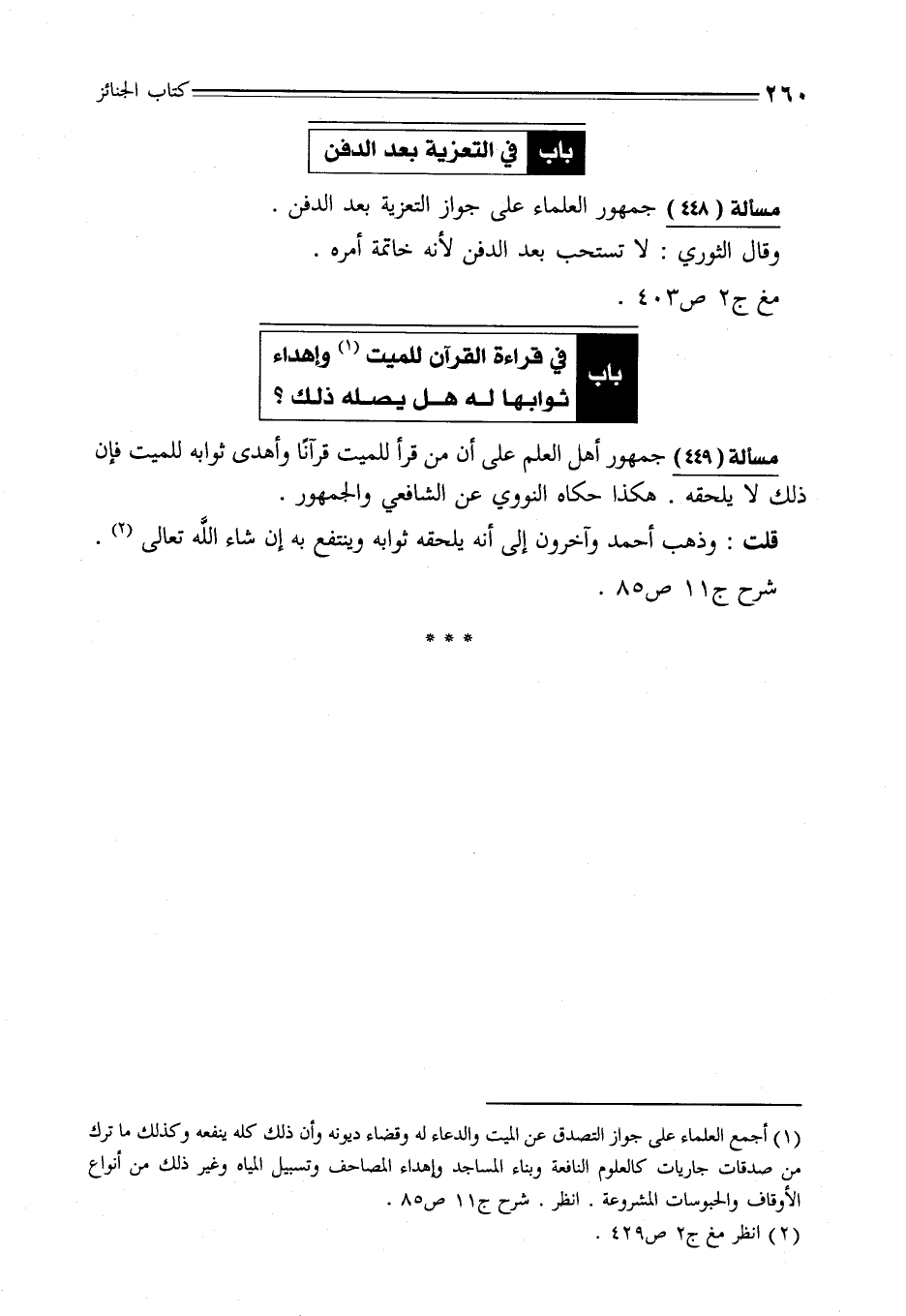 مسألة (449) جمهور أهل العلم على أن من قرأ للميت قرآنًا وأهدى ثوابه للميت فإن ذلك لا يلحقه. هكذا حكاه النووي عن الشافعي والجمهور.