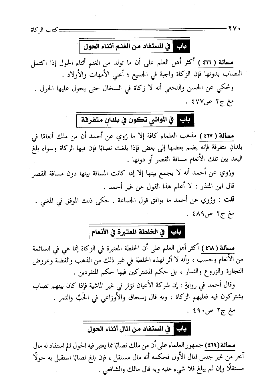 مسألة (469) جمهور العلماء على أن من ملك نصابًا مما يعتبر فيه الحول ثمَّ استفاد له مال آخر من غير جنس المال الأول فحكمه أنه مال مستقل، فإن بلغ نصابًا استقبل به حولًا مستقلًا وإن لم يبلغ فلا شيء عليه وبه قال مالك والشافعي.