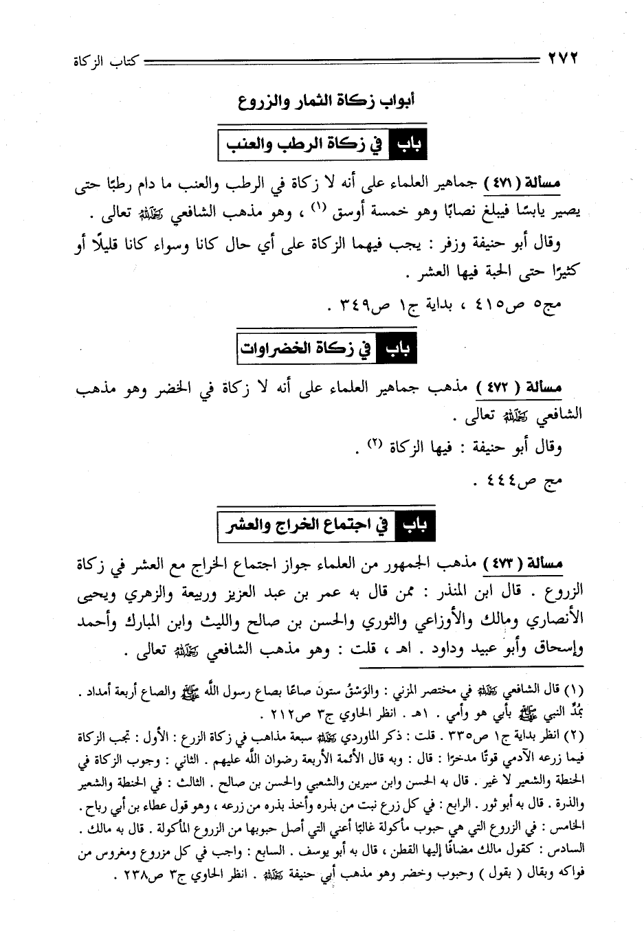(¬2) انظر بداية ج 1 ص 335. قلت: ذكر الماوردي -رحمه الله- سبعة مذاهب في زكاة الزرع: الأول: تجب الزكاة فيما زرعه الآدمي قوتًا مدخرًا: قال: وبه قال الأئمة الأربعة رضوان الله عليهم. الثاني: وجوب الزكاة في الحنطة والشعير لا غير. قال به الحسن وابن سيرين والشعبي والحسن بن صالح. الثالث: في الحنطة والشعير والذرة. قال به أبو ثور. الرابع: في كل زرع نبت من بذره وأخذ بذره من زرعه، وهو قول عطاء بن أبي رباح. الخامس: في الزروع التي هي حبوب مأكولة غالبًا أعني التي أصل حبوبها من الزروع المأكولة. قال به مالك. السادس: كقول مالك مضافًا إليها القطن، قال به أبو يوسف. السابع: واجب في كل مزروع ومغروس من فواكه وبقال (بقول) وحبوب وخضر وهو مذهب أبي حنيفة -رحمه الله-. انظر الحاوي ج 3 ص 238.