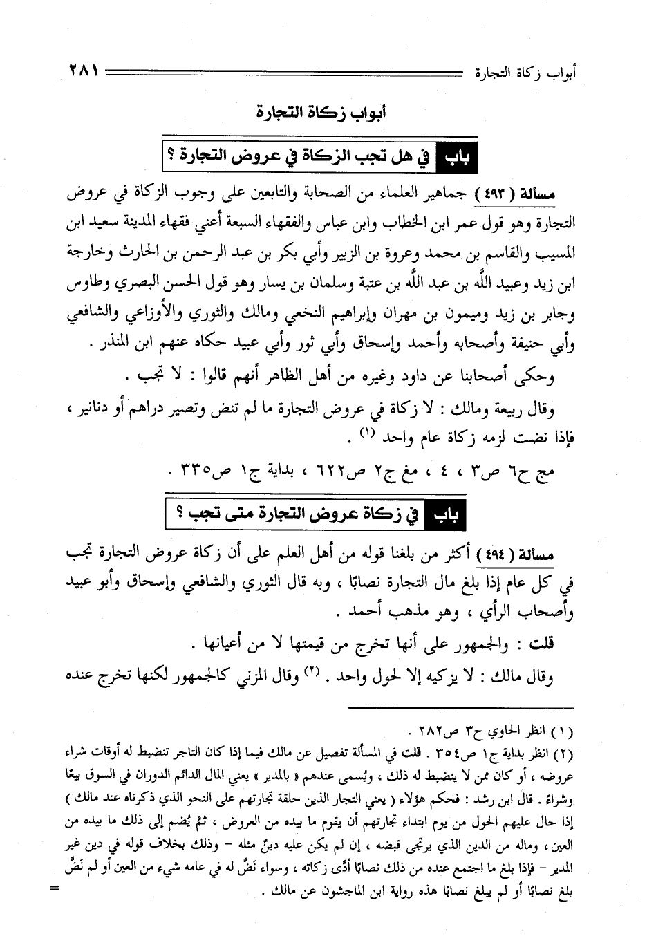 مسألة (494) أكثر من بلغنا قوله من أهل العلم على أن زكاة عروض التجارة تجب في كل عام إذا بلغ مال التجارة نصابًا، وبه قال الثوري والشافعي وإسحاق وأبو عبيد وأصحاب الرأي، وهو مذهب أحمد.
