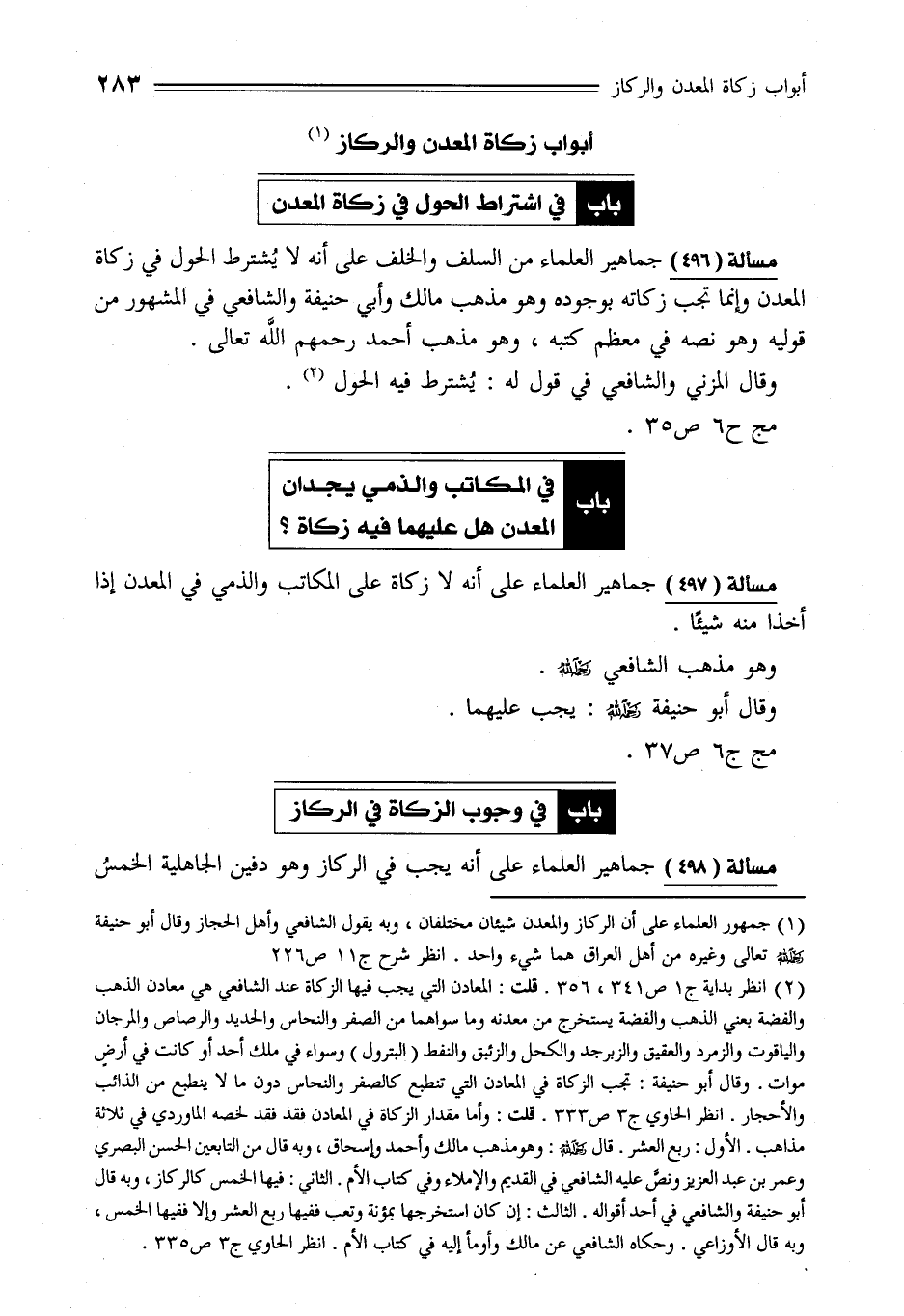 مسألة (496) جماهير العلماء من السلف والخلف على أنه لا يُشترط الحول في زكاة المعدن وإنما تجب زكاته بوجوده وهو مذهب مالك وأبي حنيفة والشافعي في المشهور من قوليه وهو نصه في معظم كتبه، وهو مذهب أحمد رحمهم الله تعالى.