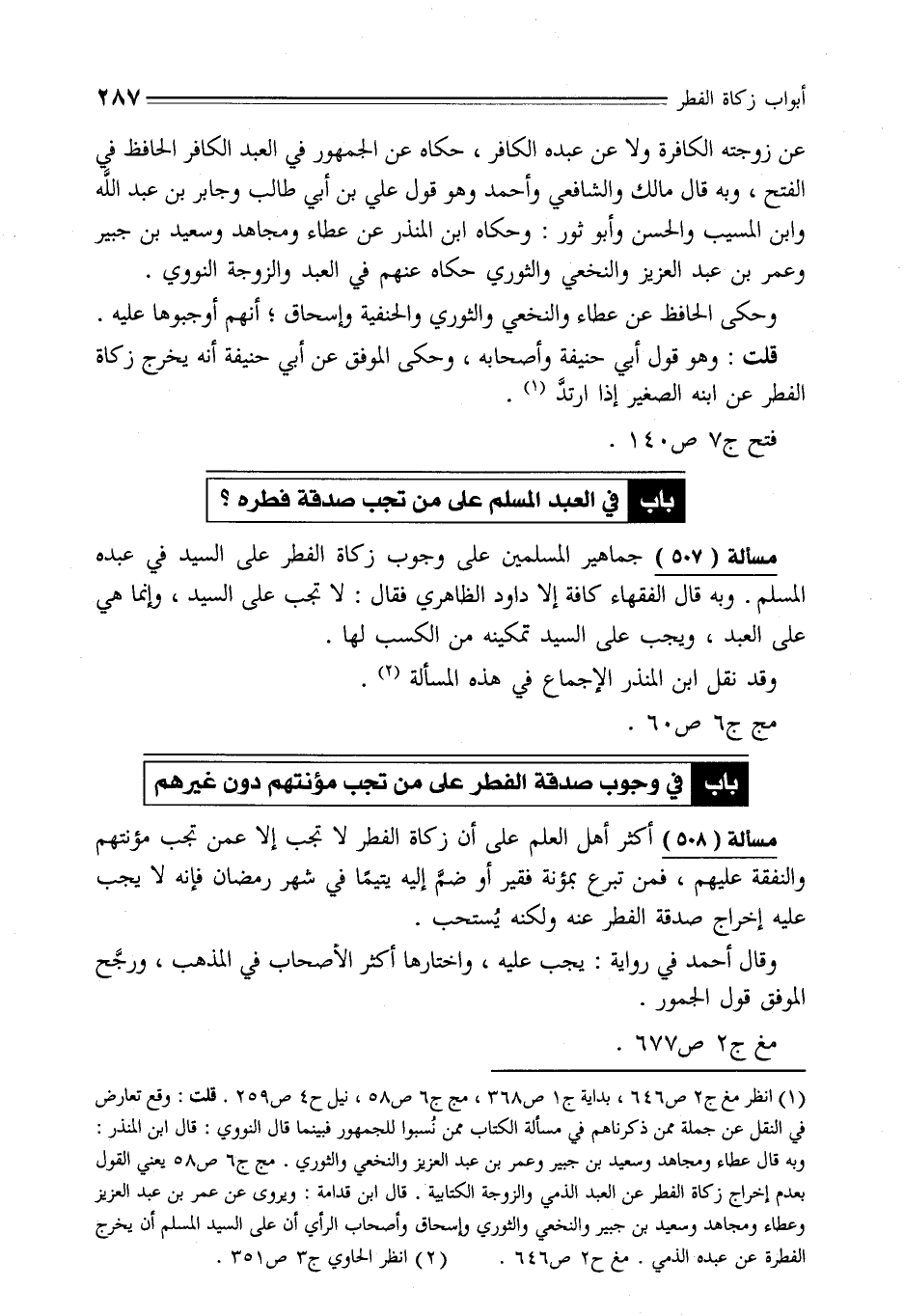 (¬1) انظر مغ ج 2 ص 646، بداية ج 1 ص 368، مج ج 6 ص 58، نيل ح 4 ص 259. قلت: وقع تعارض في النقل عن جملة ممن ذكرناهم في مسألة الكتاب ممن نُسبوا للجمهور فبينما قال النووي: قال ابن المنذر: وبه قال عطاء ومجاهد وسعيد بن جبير وعمر بن عبد العزيز والنخعي والثوري. مج ج 6 ص 58 يعني القول بعدم إخراج زكاة الفطر عن العبد الذمي والزوجة الكتابية. قال ابن قدامة: ويروى عن عمر بن عبد العزيز وعطاء ومجاهد وسعيد بن جبير والنخعي والثوري وإسحاق وأصحاب الرأي أن على السيد المسلم أن يخرج الفطرة عن عبده الذمي. مغ ح 2 ص 646.