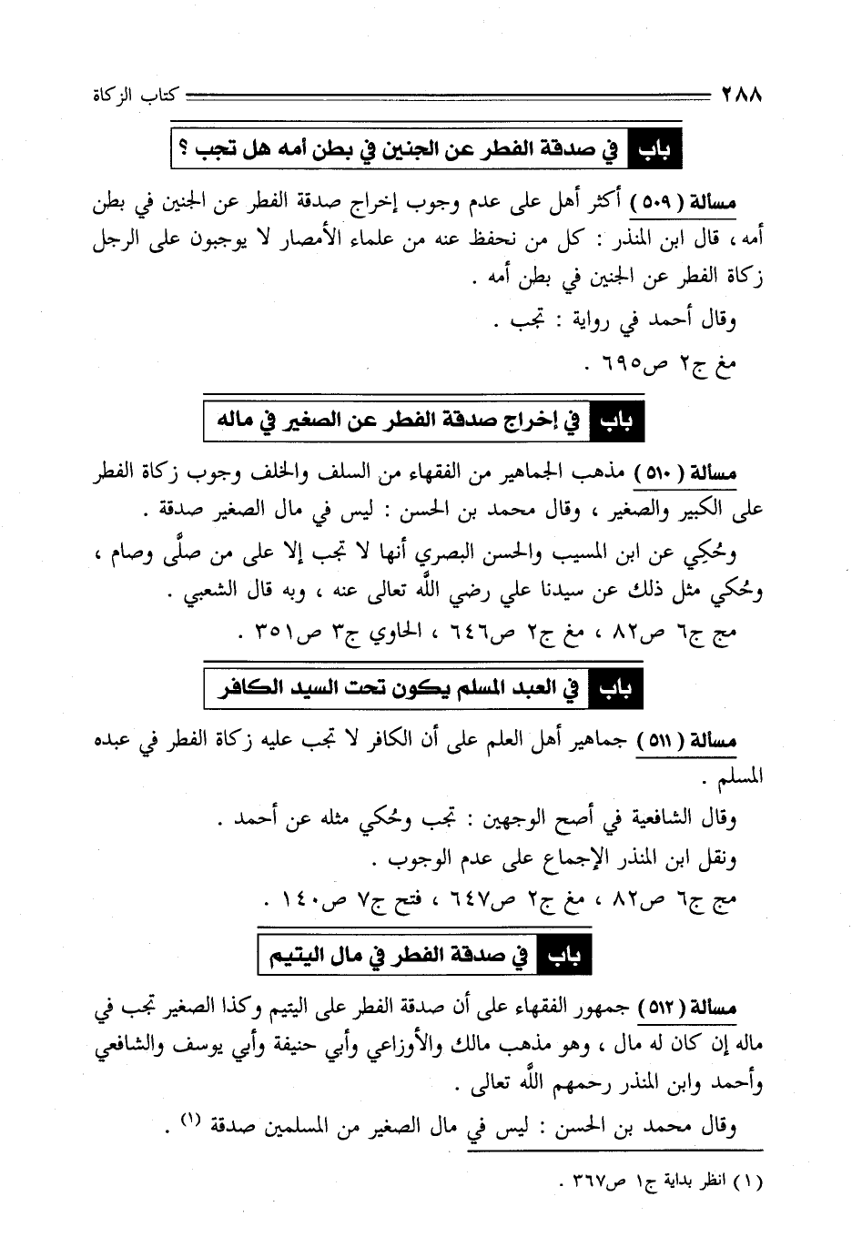 مسألة (509) أكثر أهل [العلم] على عدم وجوب إخراج صدقة الفطر عن الجنين في بطن أمه، قال ابن المنذر: كل من نحفظ عنه من علماء الأمصار لا يوجبون على الرجل زكاة الفطر عن الجنين في بطن أمه.