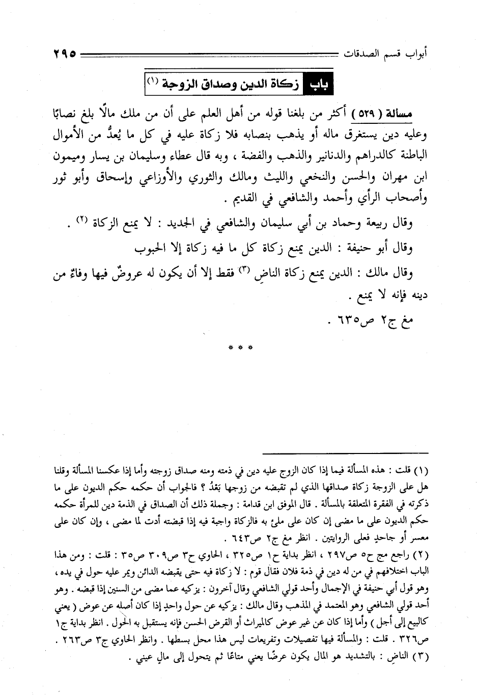 (¬1) قلت: هذه المسألة فيما إذا كان الزوج عليه دين في ذمته ومنه صداق زوجته وأما إذا عكسنا المسألة وقلنا هل على الزوجة زكاة صداقها الذي لم تقبضه من زوجهًا بَعْدُ؟ فالجواب أن حكمه حكم الديون على ما ذكرته في الفقرة المتعلقة بالمسألة. قال الموفق ابن قدامة: وجملة ذلك أن الصداق في الذمة دين للمرأة حكمه حكم الديون على ما مضى إن كان على ملئ به فالزكاة واجبة فيه إذا قبضته أدت لما مضى، وإن كان على معسر أو جاحدٍ فعلى الروايتين. انظر مغ ج 2 ص643.