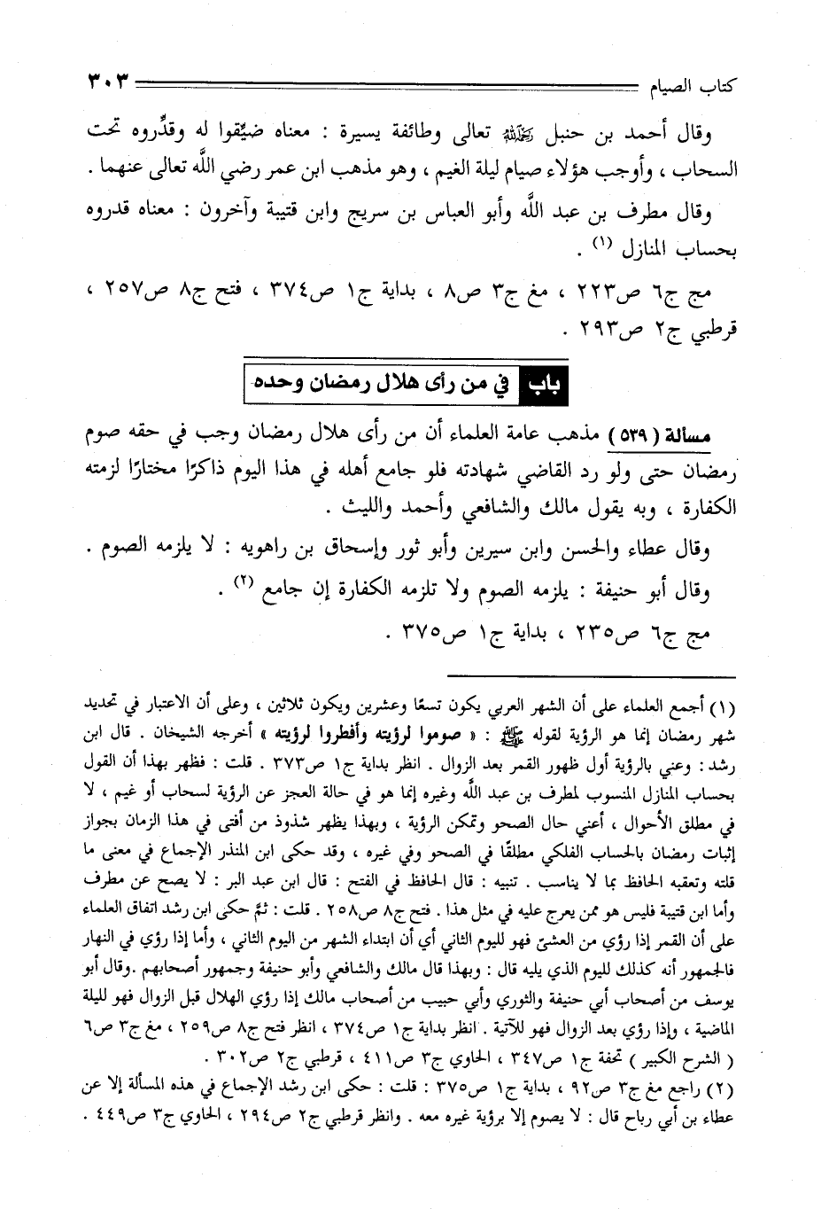 (¬2) راجع مغ ج 3 من 92، بداية ج 1 ص 375: قلت: حكى ابن رشد الإجماع في هذه المسألة إلا عن عطاء بن أبي رباح قال: لا يصوم إلا برؤية غيره معه. وانظر قرطبي ج 2 ص 294، الحاوي ج 3 ص 449.
