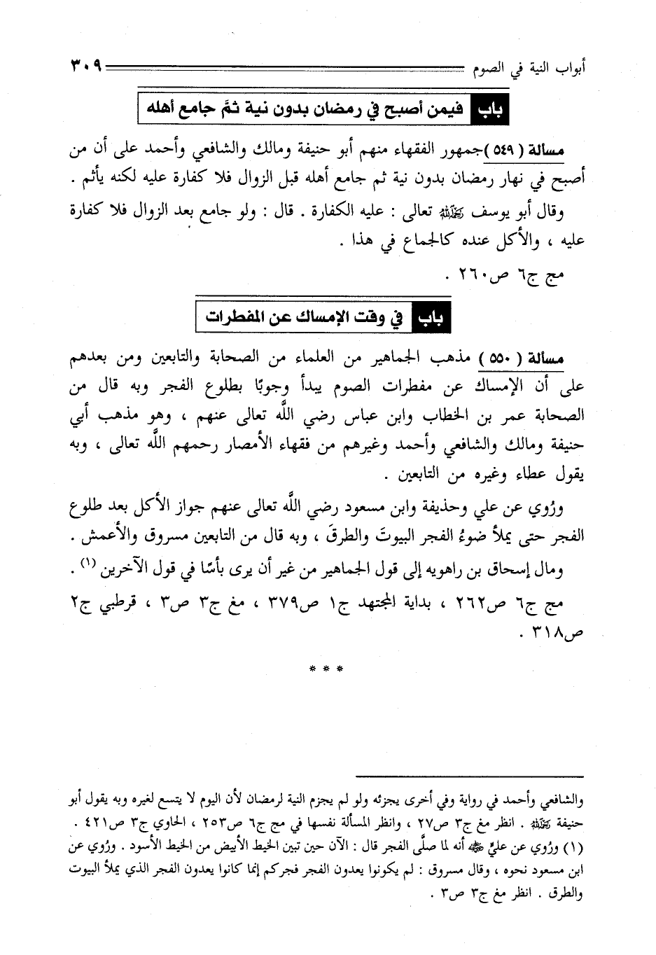 مسألة (550) مذهب الجماهير من العلماء من الصحابة والتابعين ومن بعدهم على أن الإمساك عن مفطرات الصوم ييدأ وجوبًا بطلوع الفجر وبه قال من الصحابة عمر بن الخطاب وابن عباس رضي الله تعالى عنهم، وهو مذهب أبي حنيفة ومالك والشافعي وأحمد وغيرهم من فقهاء الأمصار رحمهم الله تعالى، وبه يقول عطاء وغيره من التابعين.