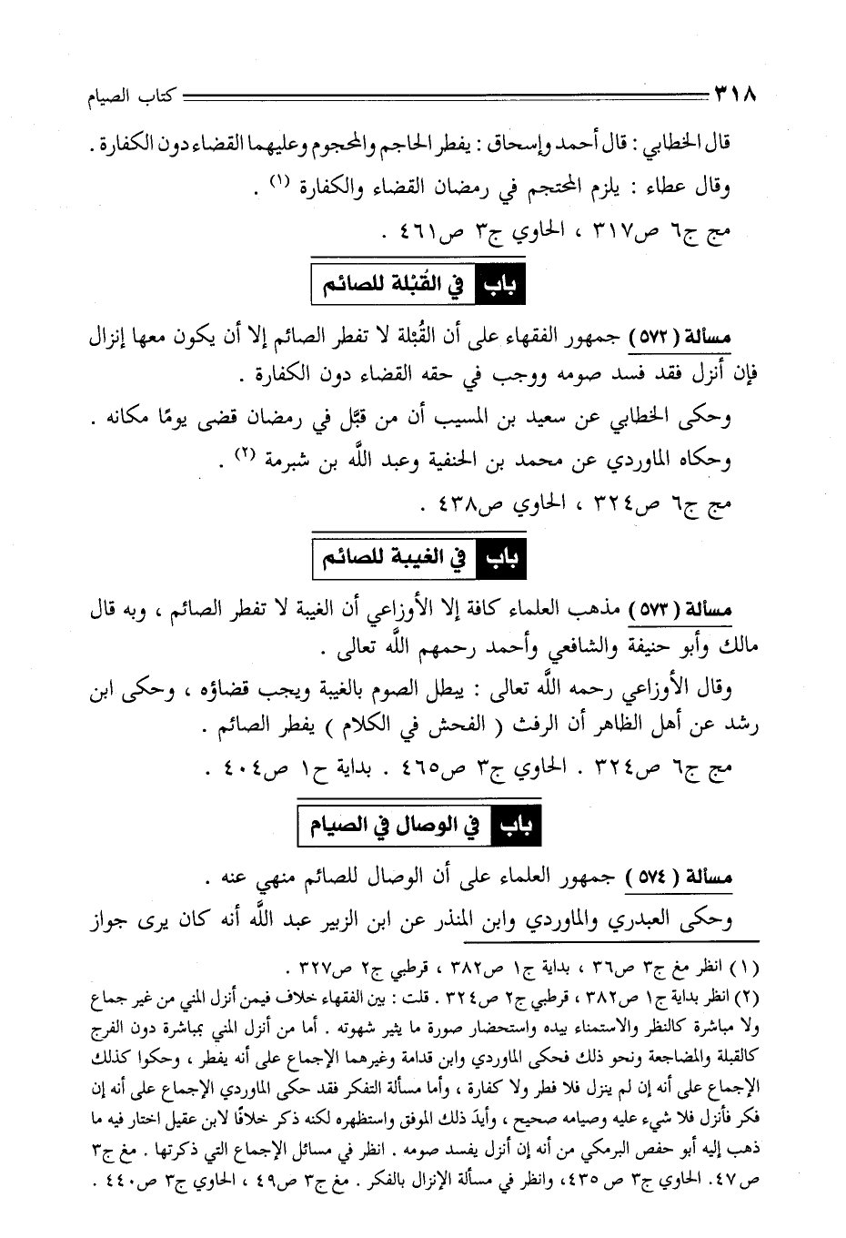 (¬2) انظر بداية ج 1 ص 382، قرطبي ج 2 ص 324. قلت: بين الفقهاء خلاف فيمن أنزل المني من غير جماع ولا مباشرة كالنظر والاستمناء بيده واستحضار صورة ما يثير شهوته. أما من أنزل المني بمباشرة دون الفرج كالقبلة والمضاجعة ونحو ذلك فحكى الماوردي وابن قدامة وغيرهما الإجماع على أنه يفطر، وحكوا كذلك الإجماع على أنه إن لم ينزل فلا فطر ولا كفارة، وأما مسألة التفكر فقد حكى الماوردي الإجماع على أنه إن فكر فأنزل فلا شيء عليه وصيامه صحيح، وأيدَ ذلك الموفق واستظهره لكنه ذكر خلافًا لابن عقيل اختار فيه ما ذهب إليه أبو حفص البرمكي من أنه إن أنزل يفسد صومه. انظر في مسائل الإجماع التي ذكرتها مغ ج 3 ص 47. الحاوي ج 3 ص 435، وانظر في مسألة الإنزال بالفكر. مغ ج 3 ص 49، الحاوي ج 3 ص440.