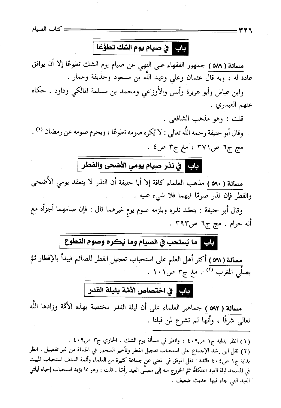 (¬2) نقل ابن رشد الإجماع على استحباب تعجيل الفطر وتأخير السحور في الجملة من غير تفصيل. انظر بداية ج 1 ص 404 فائدة: نقل الموفق في المغني عن جماعة كثيرة من العلماء وأئمة السلف استحباب المبيت في المسجد ليلة العيد اعتكافًا ثمَّ الخروج منه إلى مصلَّى العيد رأسًا. قلت: وهو مما يؤيد استحباب إحياء ليلتي العيد التي جاء فيها حديث ضعيف.