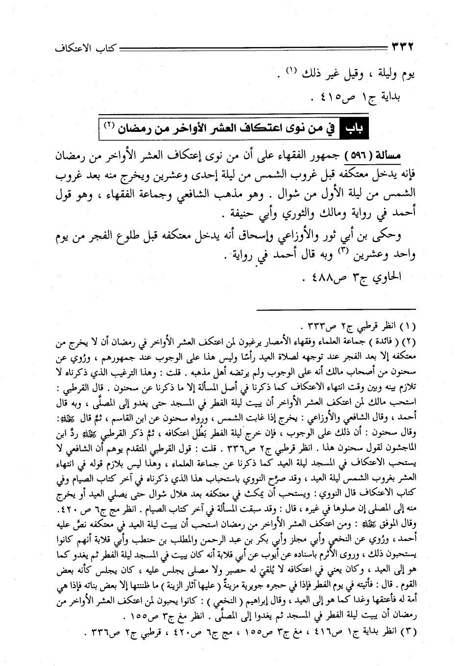 (¬2) (فائدة) جماعة العلماء وفقهاء الأمصار يرغبون لمن اعتكف العشر الأواخر في رمضان أن لا يخرج من معتكفه إلا بعد الفجر عند توجهه لصلاة العيد رأسًا وليس هذا على الوجوب عند جمهورهم، وروي عن سحنون من أصحاب مالك أنه على الوجوب ولم يرتضه أهل مذهبه. قلت: وهذا الترغيب الذي ذكرناه لا تلازم بينه وبين وقت انتهاء الاعتكاف كما ذكرنا في أصل المسألة إلا ما ذكرنا عن سحنون. قال القرطبي: استحب مالك لمن اعتكف العشر الأواخر أن يبيت ليلة الفطر في المسجد حتى يغدو إلى المصلى، وبه قال أحمد، وقال الشافعي والأوزاعي: يخرج إذا غابت الشمس، ورواه سحنون عن ابن القاسم، ثمَّ قال -رحمه الله-: وقال سحنون: أن ذلك على الوجوب، فإن خرج ليلة الفطر بَطُل اعتكافه، ثمَّ ذكر القرطبي -رحمه الله- ردَّ ابن الماجشون لقول سحنون هذا. انظر قرطبي ج 2 ص 336. قلت: قول القرطبي المتقدم يوهم أن الشافعي لا يستحب الاعتكاف في المسجد ليلة العيد كما ذكرنا عن جماعة العلماء، وهذا ليس بلازم قوله في انتهاء العشر بغروب الشمس ليلة العيد، وقد صرَّح النووي باستحباب هذا الذي ذكرناه في آخر كتاب الصيام وفي كتاب الاعتكاف قال النووي: ويستحب أن يمكث في معتكفه بعد هلال شوال حتى يصلي العيد أو يخرج منه إلى المصلى إن صلوها في غيره، قال: وقد سبقت المسألة في آخر كتاب الصيام. انظر مج ج 6 ص 420. وقال الموفق -رحمه الله-: ومن اعتكف العشر الأواخر من رمضان استحب أن يبيت ليلة العيد في معتكفه نصَّ عليه أحمد، ورُوي عن النخعى وأبي مجلز وأبي بكر بن عبد الرحمن والمطلب بن حنطب وأبي قلابة أنهم كانوا يستحبون ذلك، وروى الأثرم بإسناده عن أيوب عن أبي قلابة أنه كان يبيت في المسجد ليلة الفطر ثم يغدو كما هو إلى العيد، وكان يعني في اعتكافه لا يُلقيَ له حصير ولا مصلى يجلس عليه، كان يجلس كأنه بعض القوم. قال: فأتيته في يوم الفطر فإذا في حجره جويرية مزينةٌ (عليها آثار الزينة) ما ظننتها إلا بعض بناته فإذا هي أمة له فأعتقها وغدا كما هو إلى العيد، وقال إبراهيم (النخعي): كانوا يحبون لمن اعتكف العشر الأواخر من رمضان أن يبيت ليلة الفطر في المسجد ثم يغدوا إلى المصلَّى. انظر مغ ج 3 ص 155.